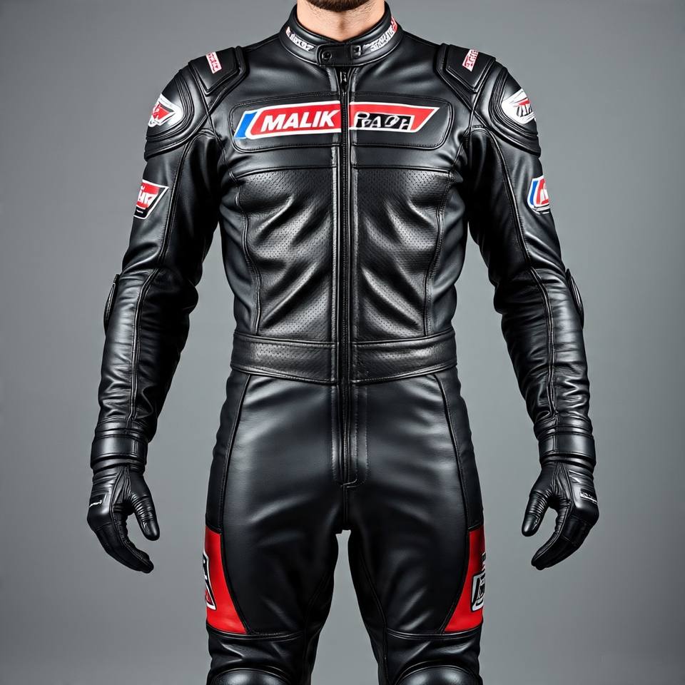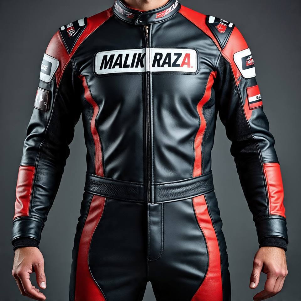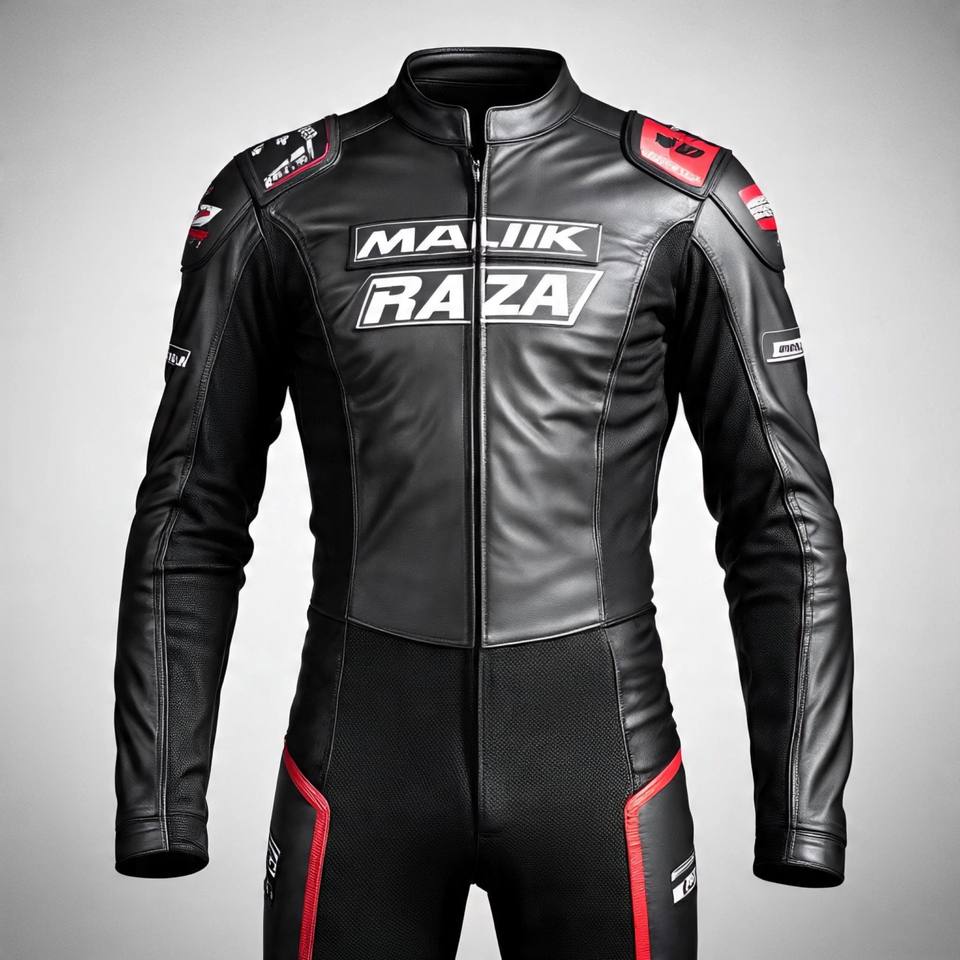 Combinaison de course de moto en cuir sur mesure | Malik Raza | Logos de tailles de couleurs personnalisées | Vente en gros à faible coût