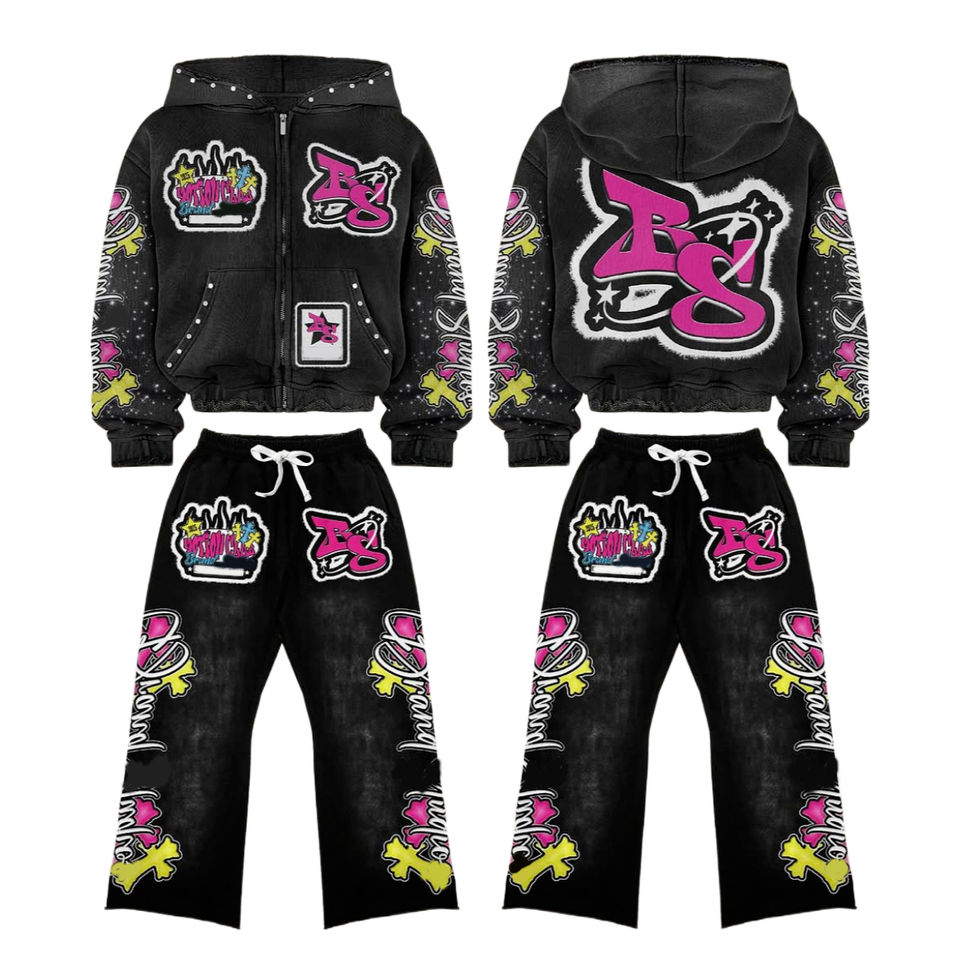 Tailored Children's Streetwear Baggy Hoodie and Stacked Pants Acid Wash Tracksuits with DTG Printed Cropped Flared Sweatsuits
