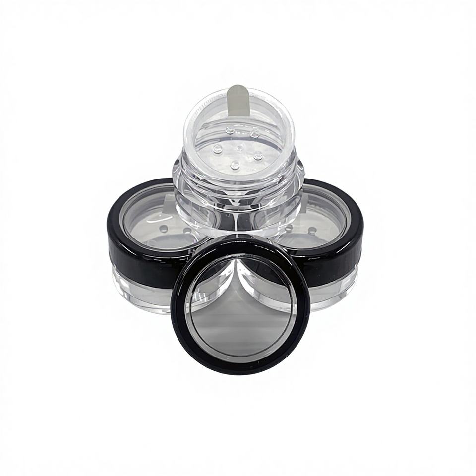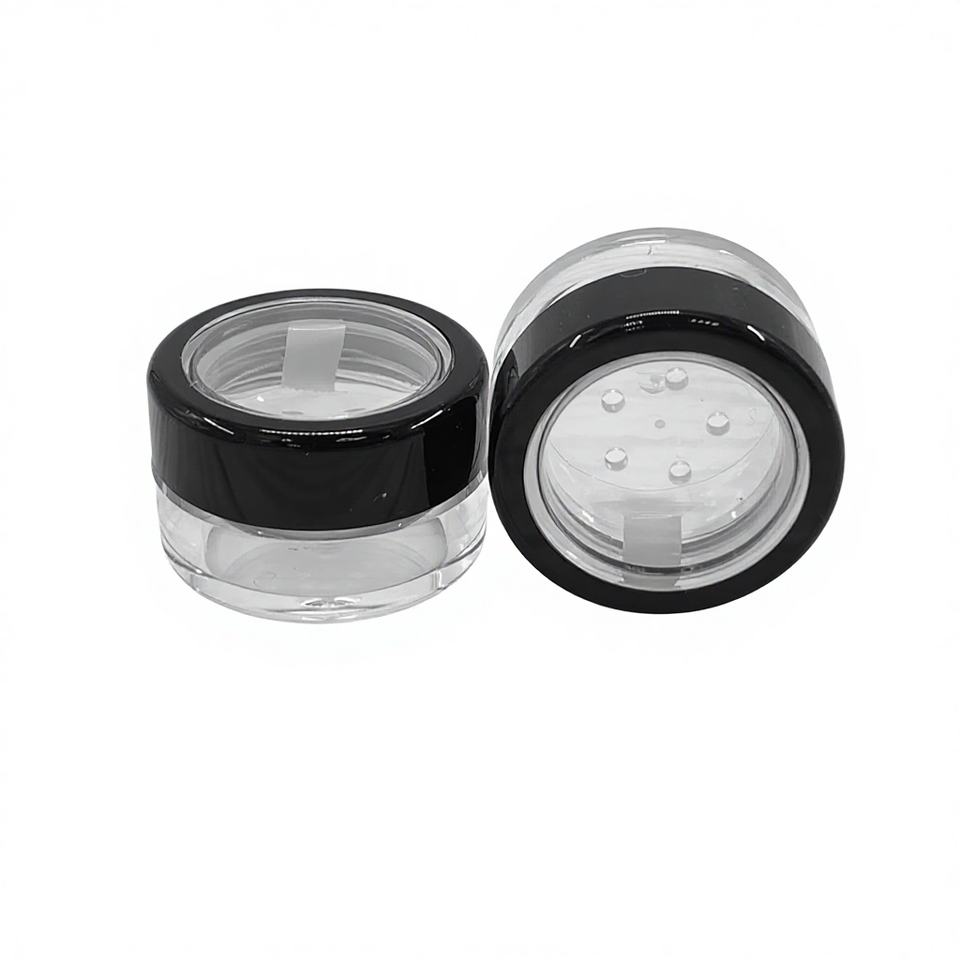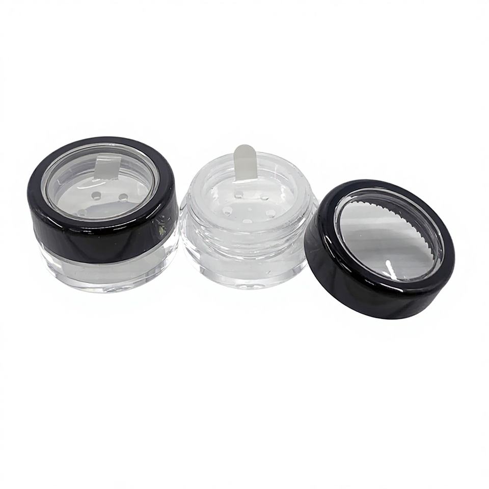 Pots cosmétiques vides en plastique 5G fabriqués à Taïwan, avec bord noir, fenêtre en acrylique, languette de fermeture, autocollant, pour poudre libre 1,5g
