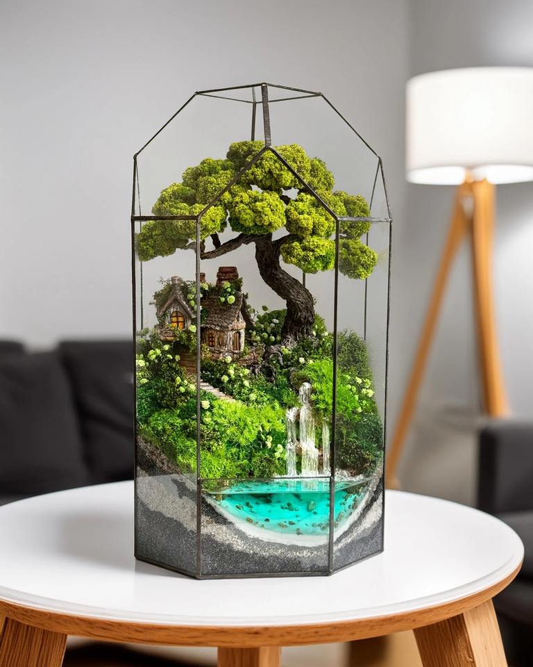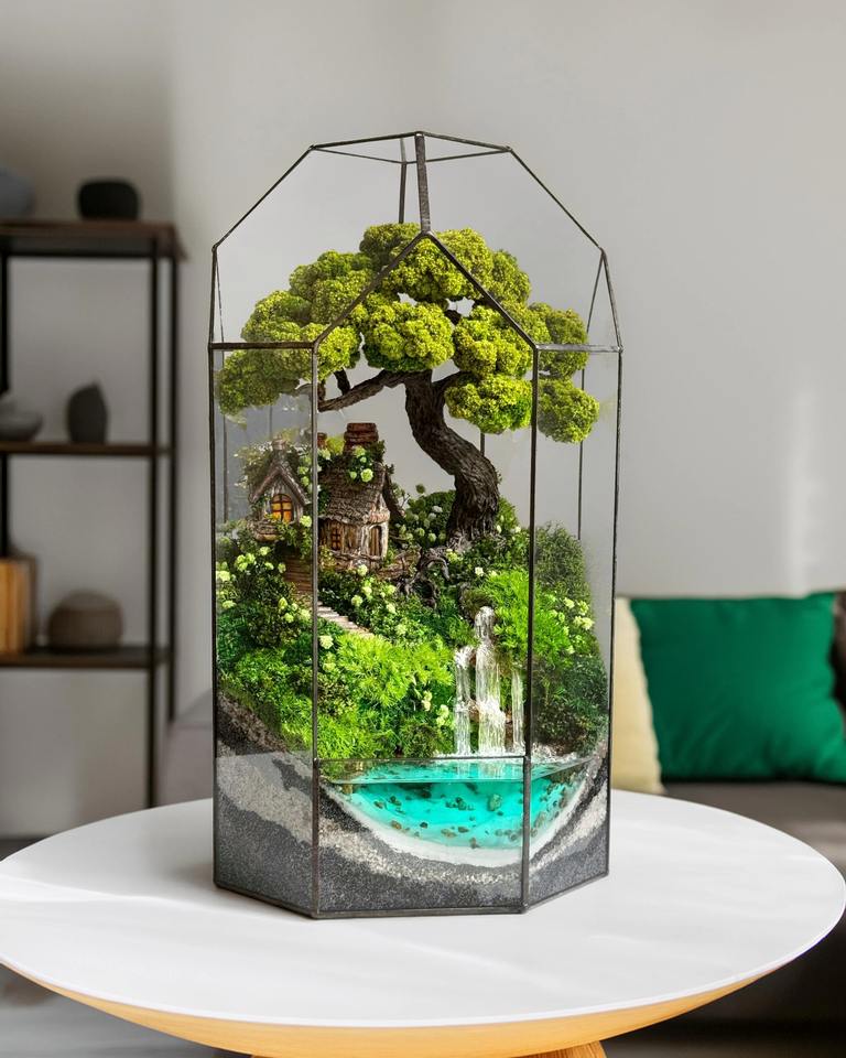 Terrarium en verre haut avec cascade et arbre de style bonsaï, décoration de table intérieure pour la maison, le bureau et les cadeaux