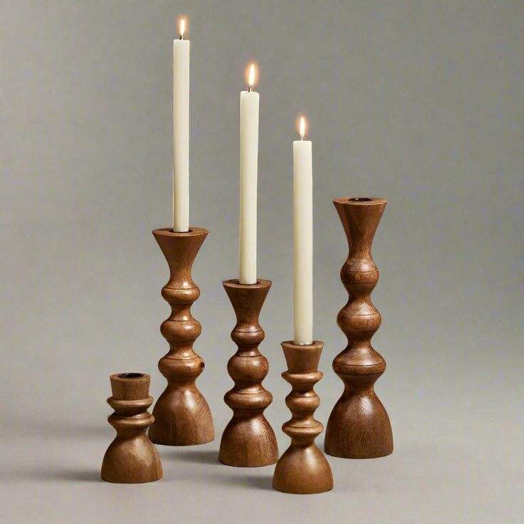 Tall turned wooden candle holder pair perfect for fireplace mantel display or romantic dining table decoration centerpiece idea