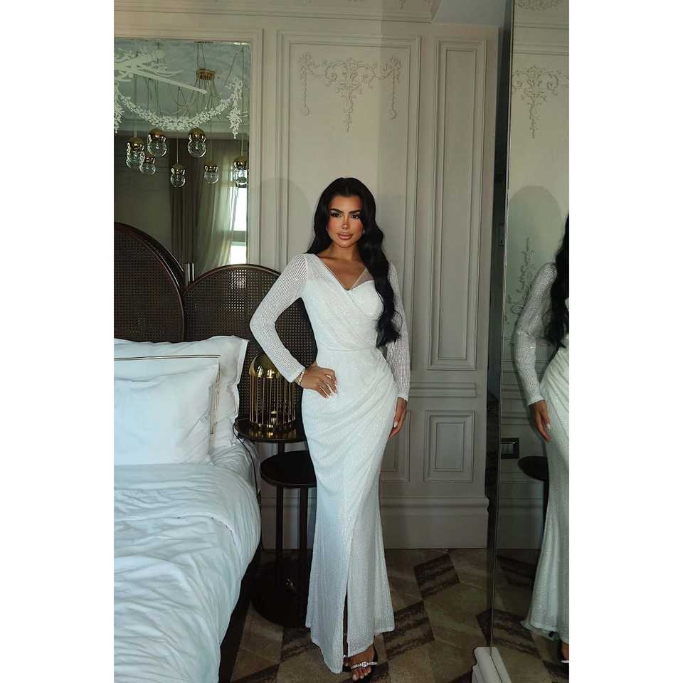 Robe de soirée longue Tamera blanche à manches longues, coupe trapèze, col dégagé, longueur ras du sol, pour soirée formelle, avec décorations de paillettes, disponible en XS