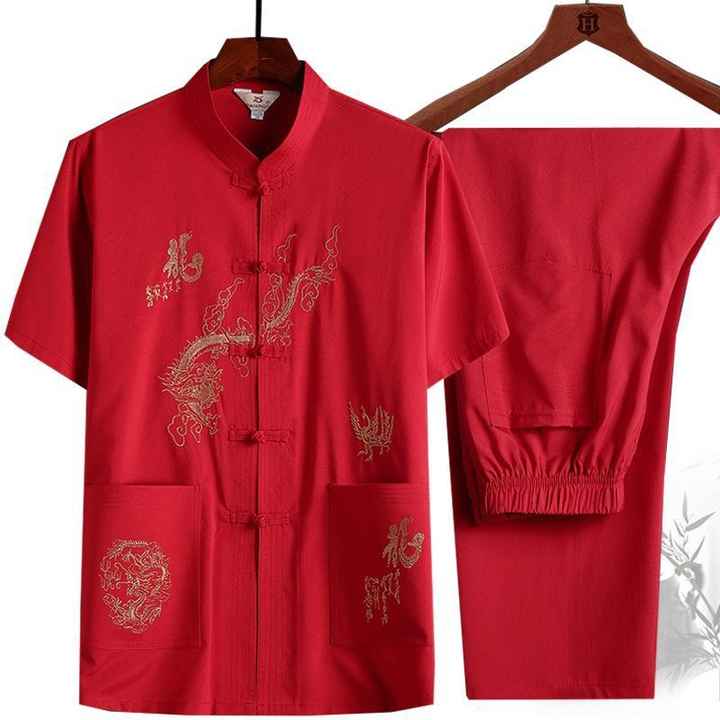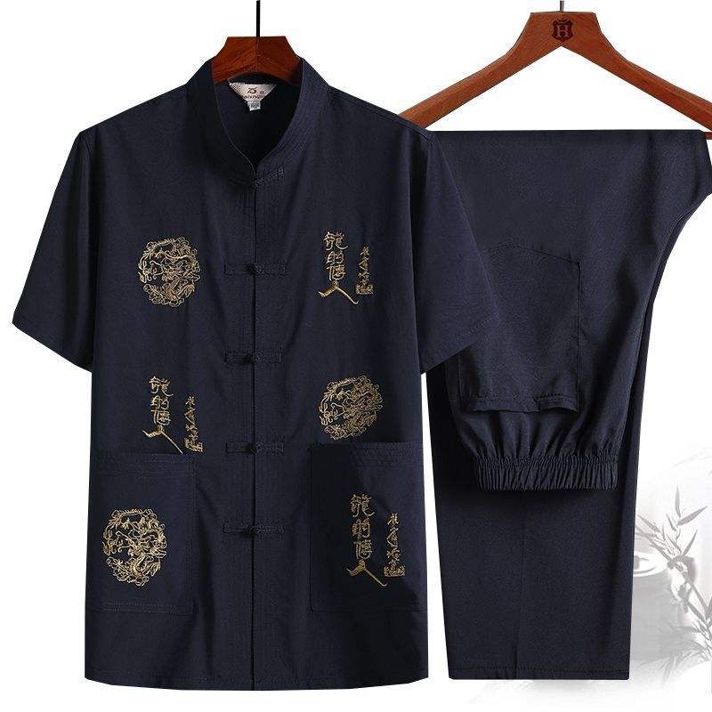 Costume Tang (haut + pantalon) pour hommes d'âge moyen et âgés, style chinois, broderie, costume Tang, grand-père, vêtements amples