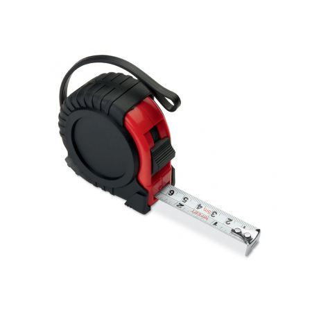 Tape measure in red casing. Includes clip and hand strap