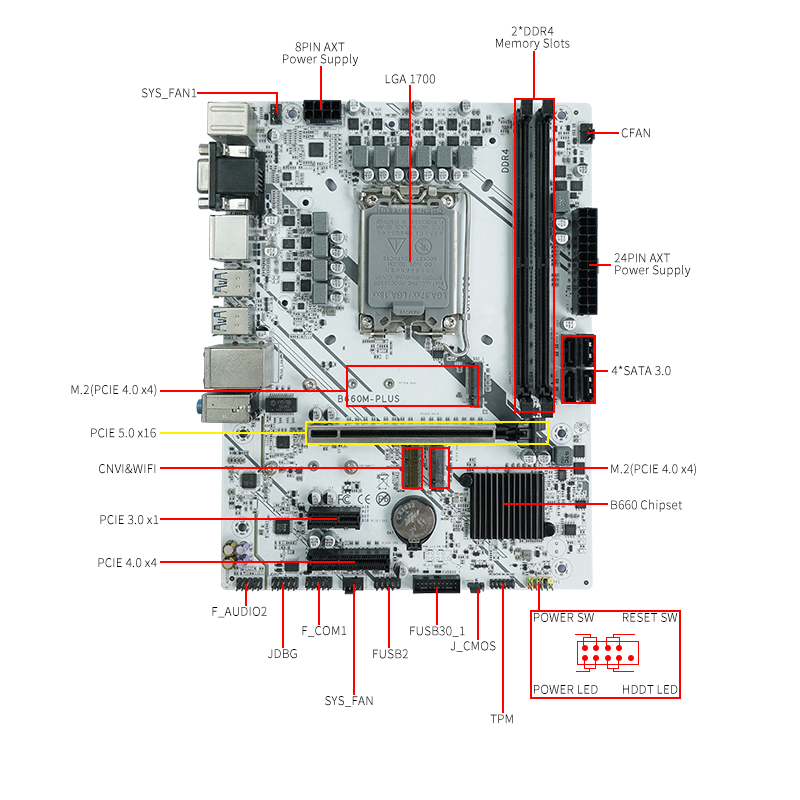 Ports:Wifi, SATA, VGA, Pci - Express X16, Pci - Express X4, USB 2.0, PS2, M.2, USB 3.0, Pci - Express X1, HDMI