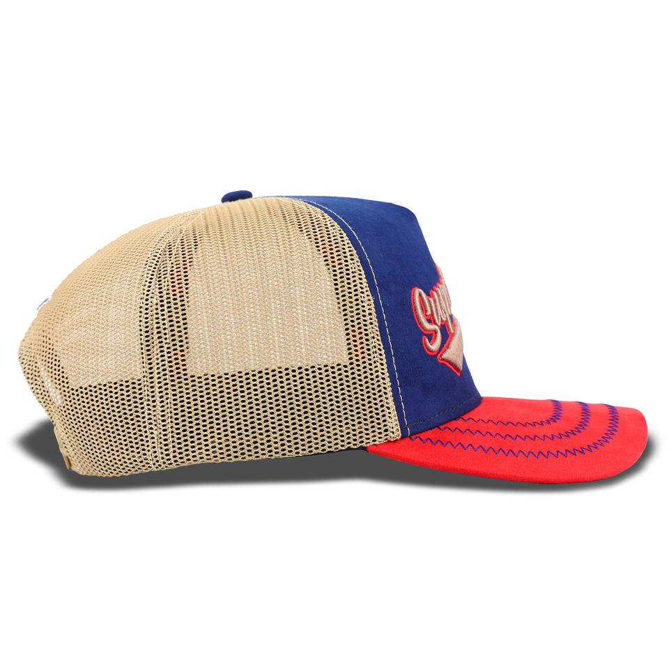 Casquettes de camionneur en daim de haute qualité personnalisées Tcap Chine, 5 panneaux, logo brodé en relief