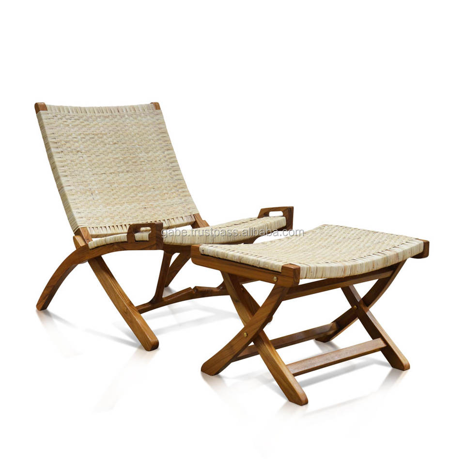 Chaise longue pliante en teck de style moderne avec tabouret en rotin naturel Chaise de loisirs en bois pour le mobilier de maison et le salon