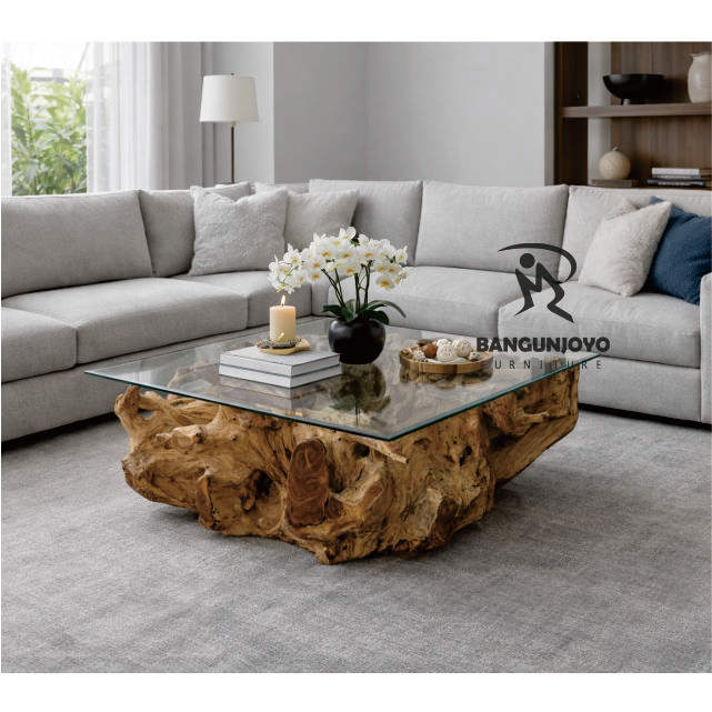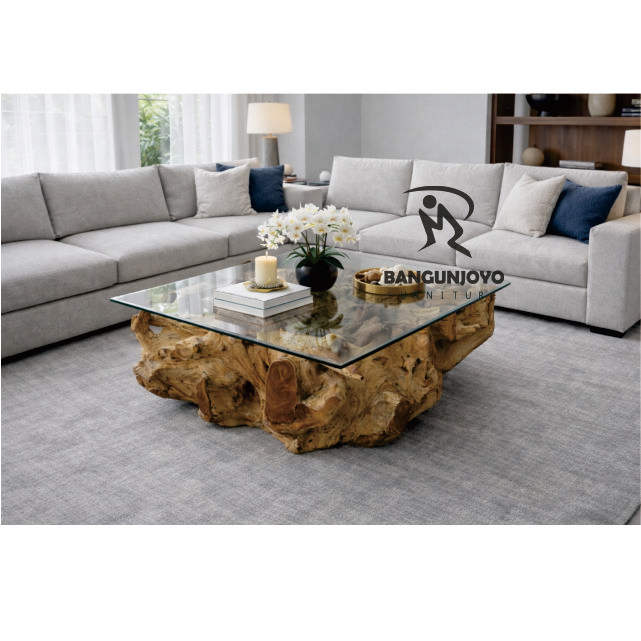 Table basse rustique multifonction en bois massif de racine de teck avec plateau en verre