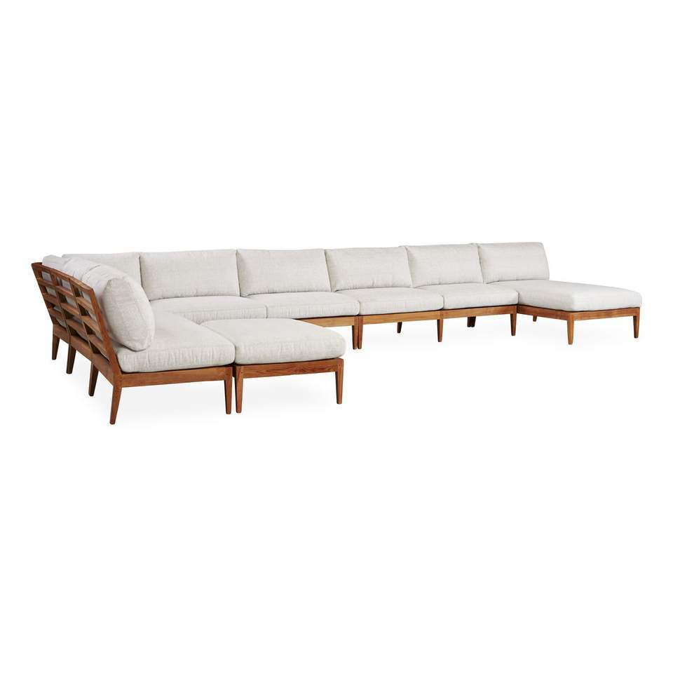 Canapé en teck de style resort en forme de L avec structure architecturale aérée et assise profondément rembourrée pour un confort optimal