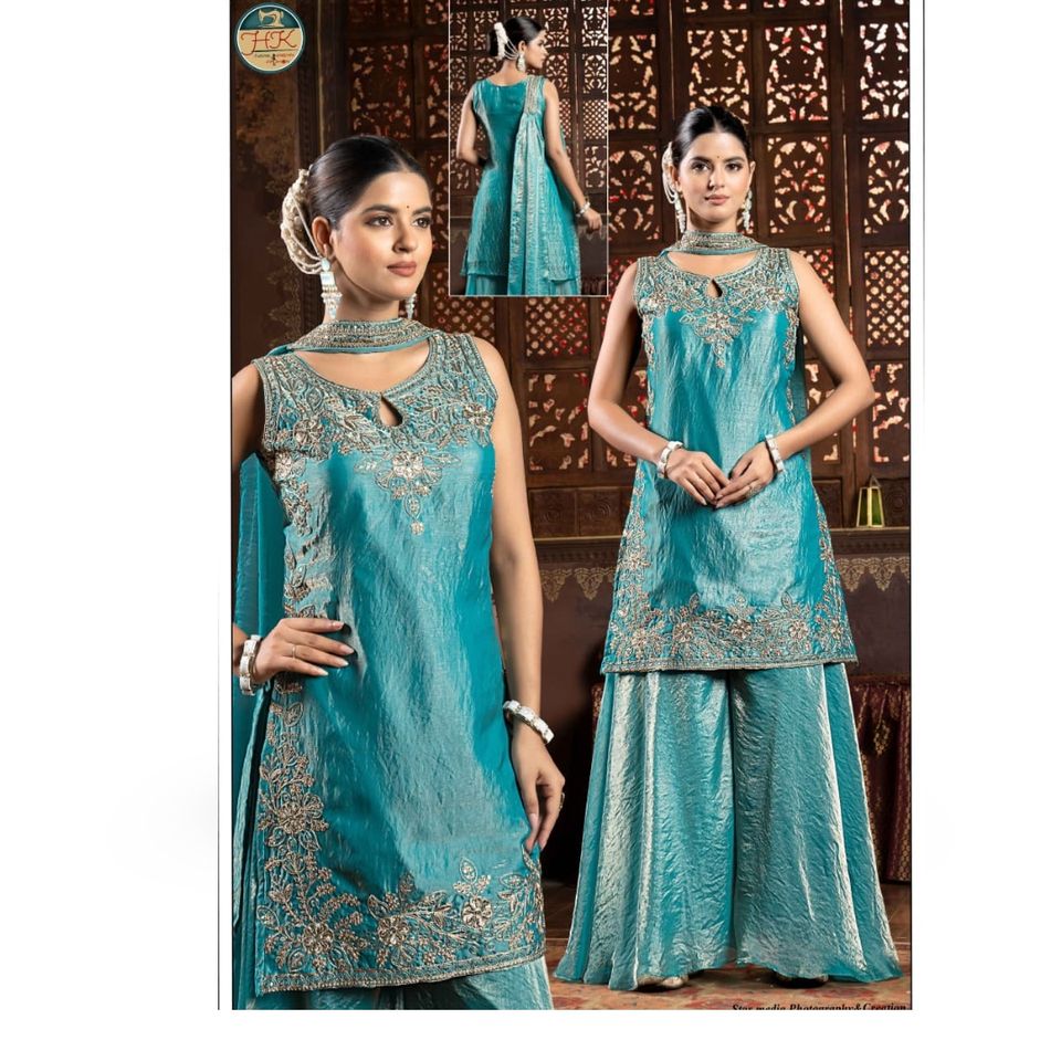 Ensemble Kurta Sharara brodé bleu sarcelle pour femmes, tenue ethnique de soirée de créateur avec dupatta, collection festive indienne