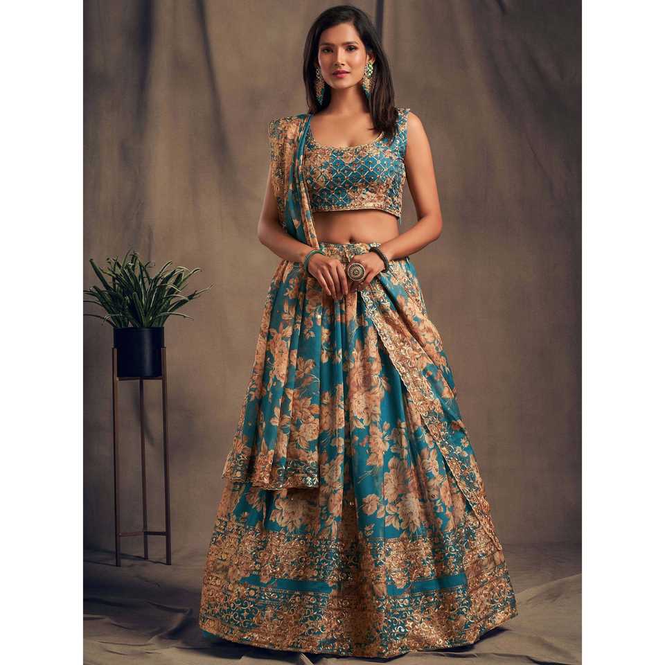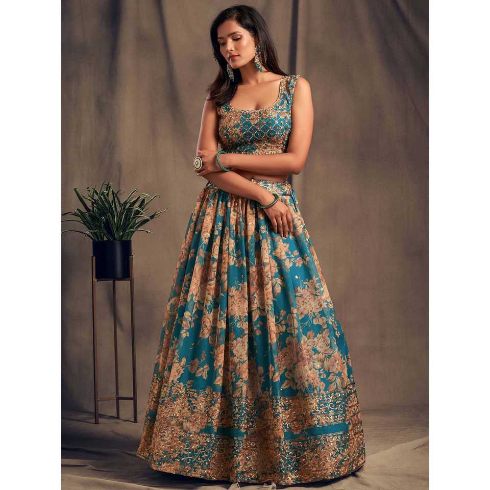 Teal Blue Floral Printed Organza Party Jumpsuit Festive Lehenga Choli