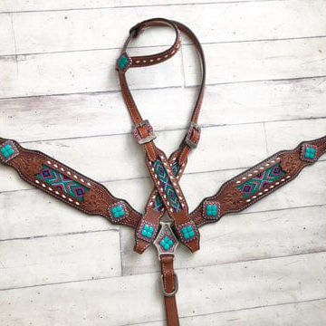 Teal & pink Beaded Inlay Tack set Premium Cowhide léger Trending designs saisonnier équipement cheval tack