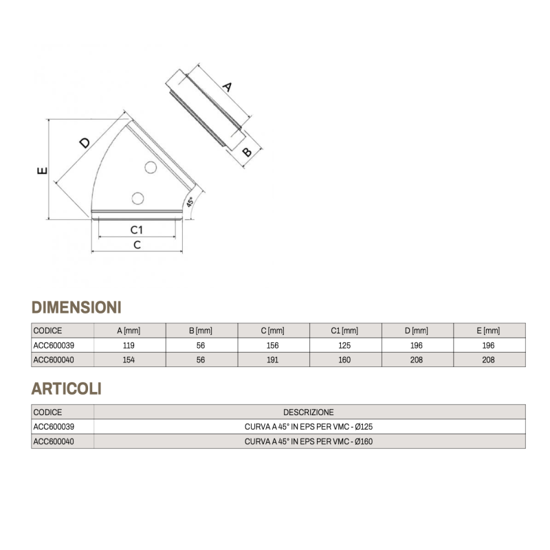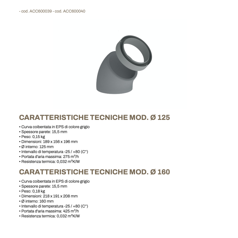 Tecnosystemi 45 EPS Bend pour systèmes CVC VMC, pièces avec diamètres de 125 et 160 mm