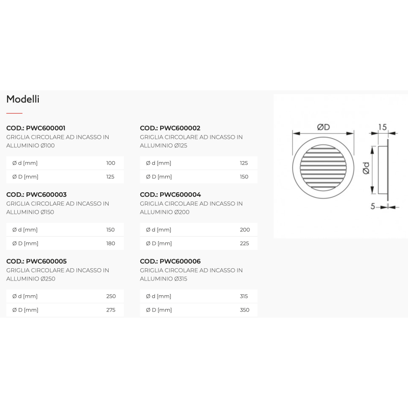 Grilles circulaires en aluminium encastrées Tecnosystemi, de haute qualité, pour systèmes CVC, avec un angle de lame de 45° et un design minimaliste