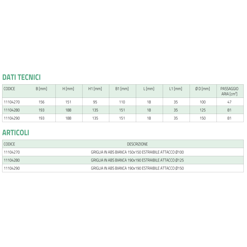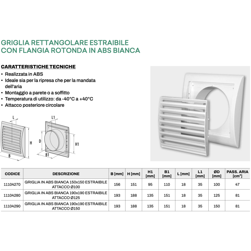 Tecnosystemi - Grille d'aération rectangulaire extractible réglable en ABS blanc avec bride ronde pour l'évacuation de l'air