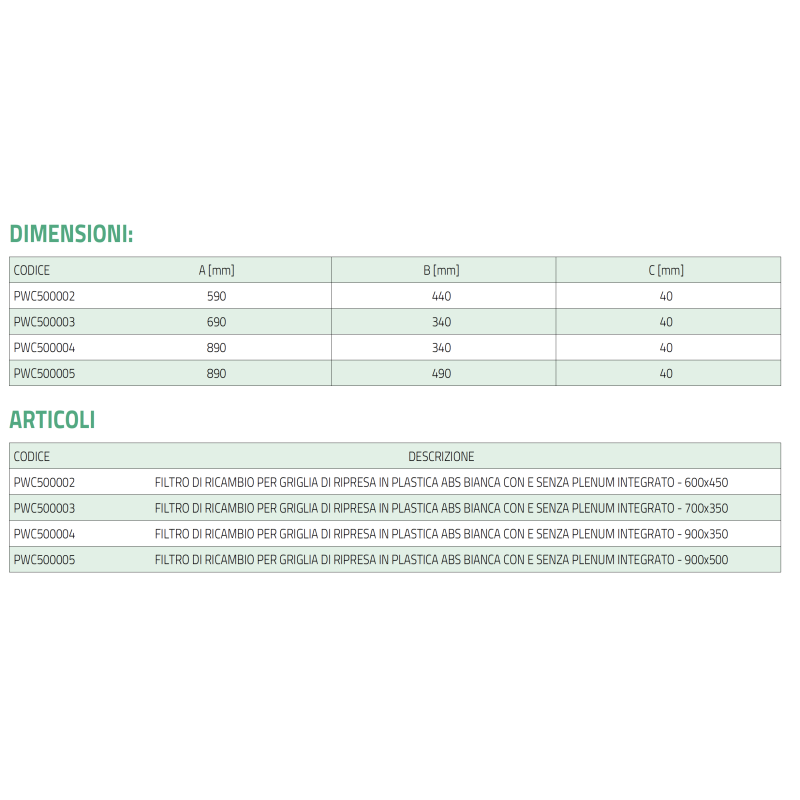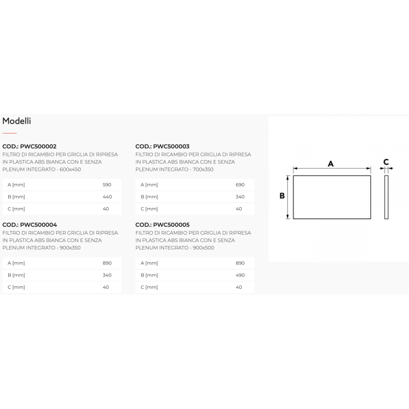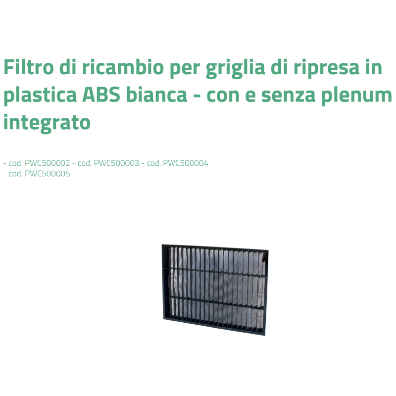 Filtre de remplacement en plastique ABS blanc Tecnosystemi pour grilles de retour et grilles avec ou sans plénum intégré