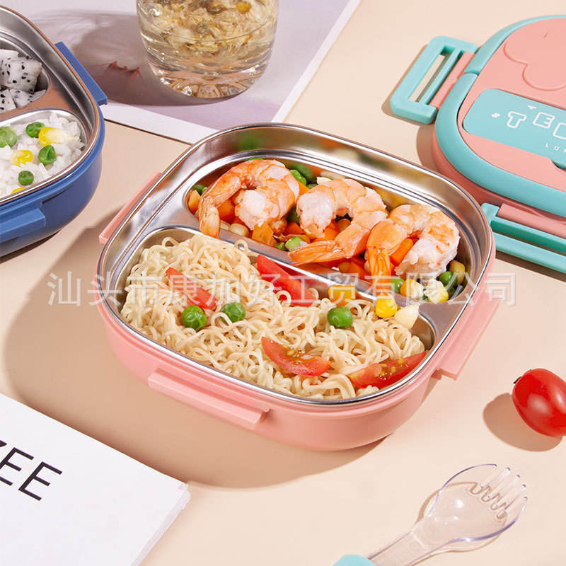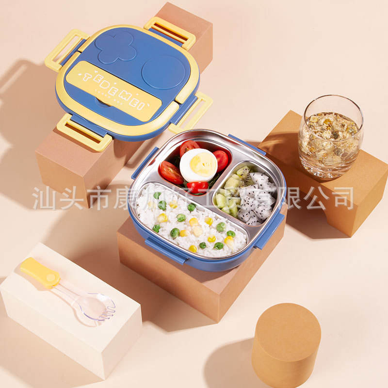 Boîte à lunch rectangulaire en plastique avec couvercle isotherme et cuillère pour enfants et tout-petits