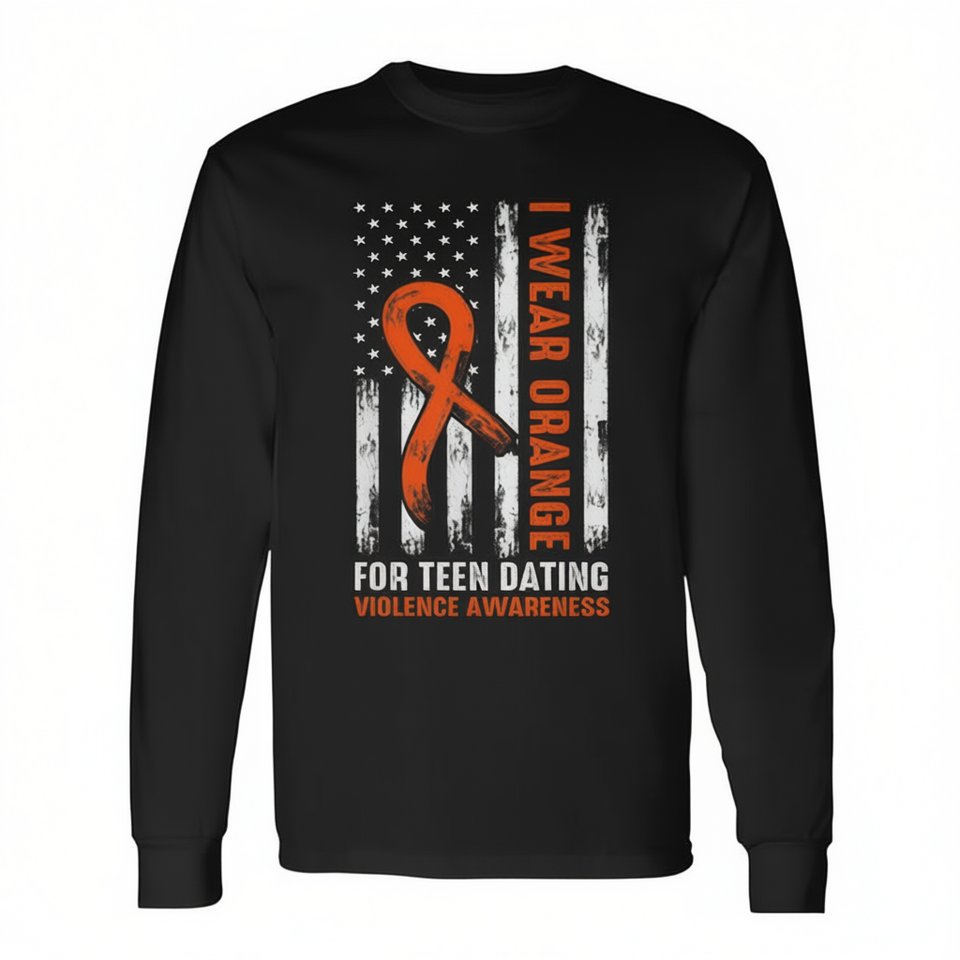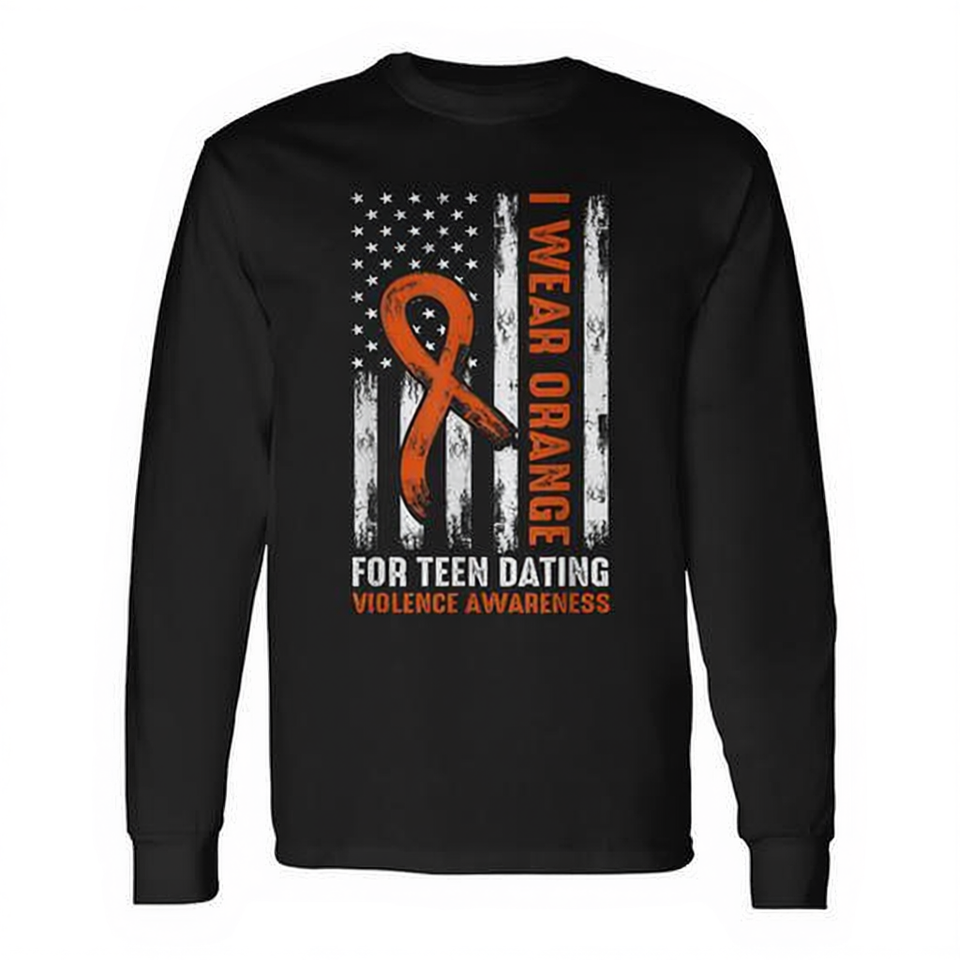 Teen Dating Violence Awareness Orange Ribbon Long Sleeve T-Shirt Unisex Crew Neck Silk Screen Printed For Walk Run Events