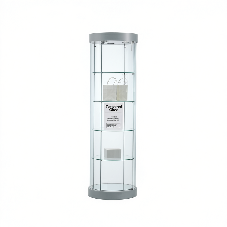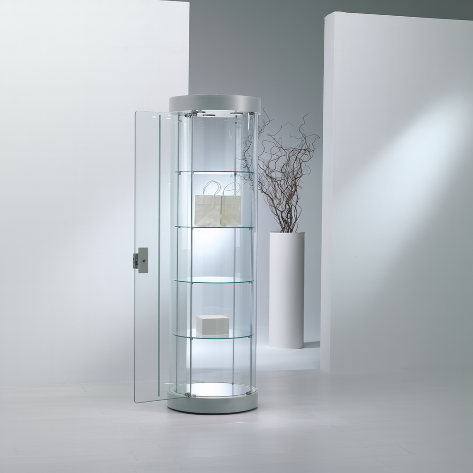 Vitrine ronde en verre trempé 57x190cm gris clair avec porte à charnières verrouillable, éclairage LED, étagères réglables