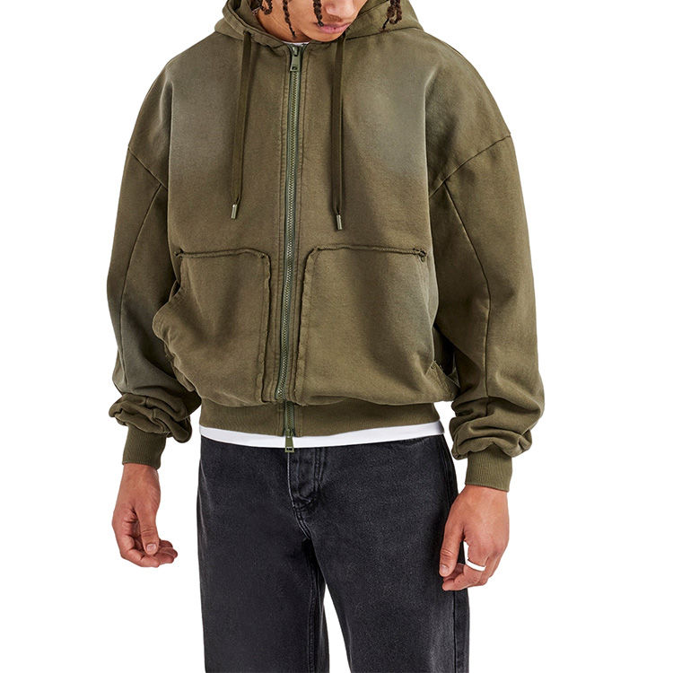 Sweat à capuche oversize de haute qualité en tissu éponge, délavé, avec fermeture éclair, poche kangourou, vintage, pour homme, vert délavé