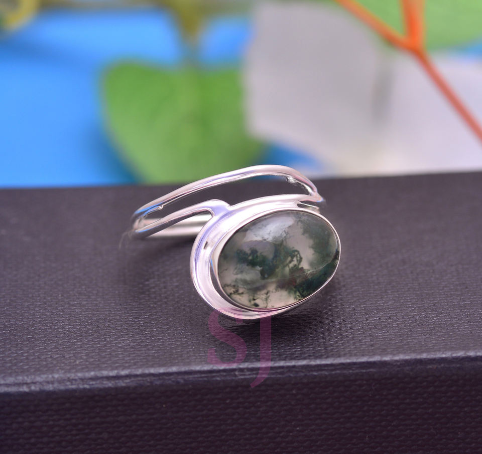 Bijoux fins personnalisés pour femmes Bague en argent sterling pur 925 Agate mousse naturelle Texture de pierre précieuse Design Cadeau d'anniversaire de mariage