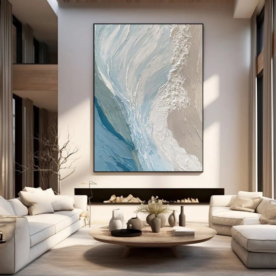 Peinture texturée, grande œuvre abstraite bleue, art mural texturé épais, peinture à l'huile encadrée sur toile pour la maison et la galerie