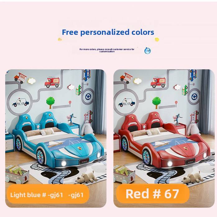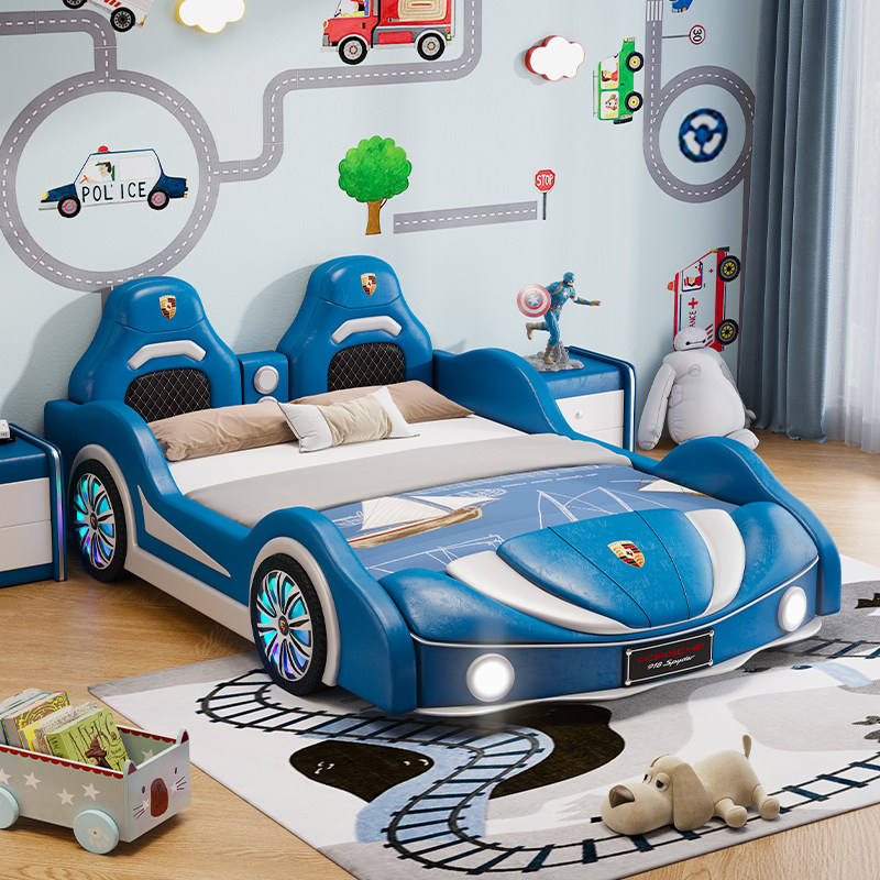 Le lit de garçon est un lit enfant de style moderne en forme de voiture avec barrière de sécurité et design de voiture de sport. C'est une voiture-lit moderne pour enfants.