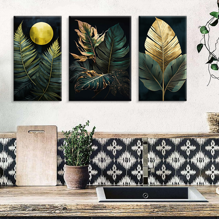 Tableau sur toile Feuilles Tropicales - Ensemble de 3 pièces Décoration Murale Botanique avec Accents Dorés pour Salon