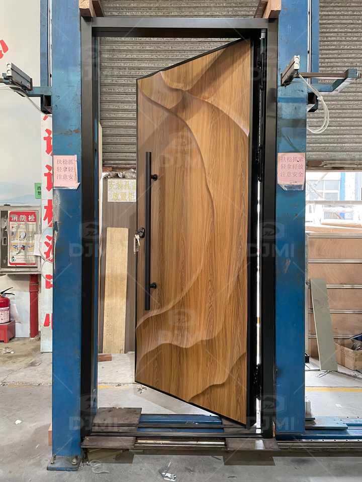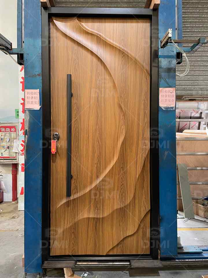Les styles d'entrée les plus populaires en 2026 Plaque en aluminium sculptée en 3D avec texture de placage de bois Porte d'entrée pour l'extérieur de la maison