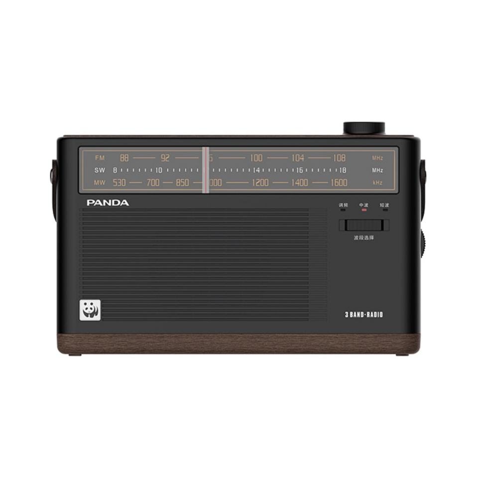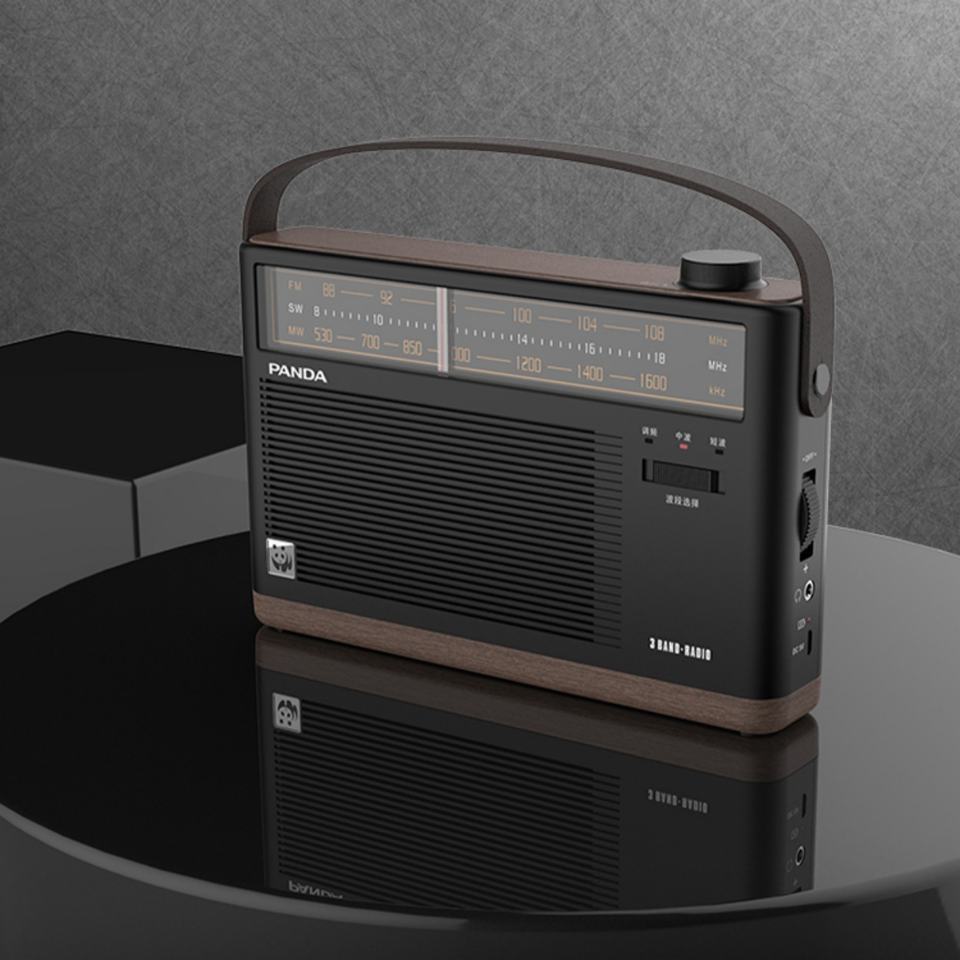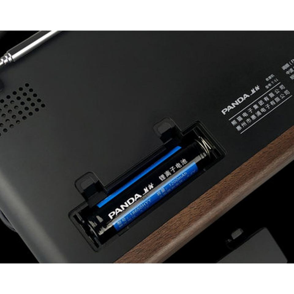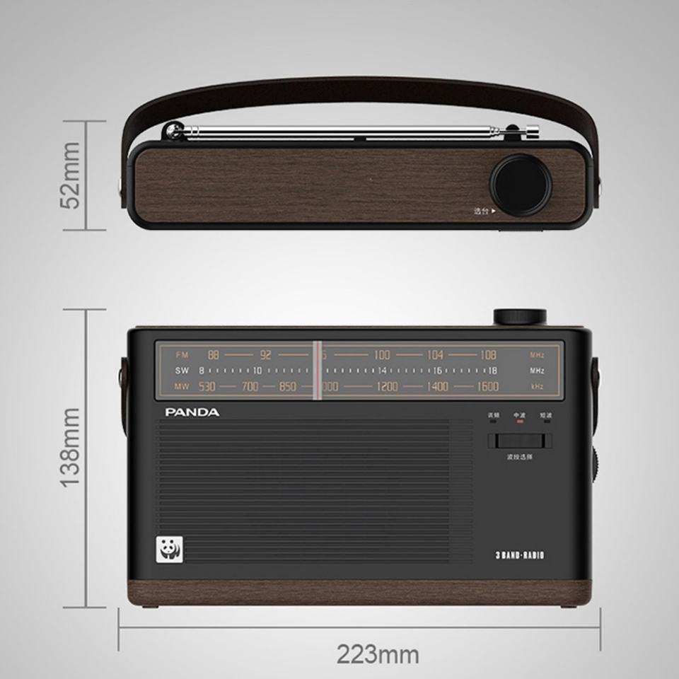 Radio portable PANDA rétro avec coque en bois grainé, 3 bandes AM/FM SW, haut-parleur intégré, batterie rechargeable et logo personnalisable