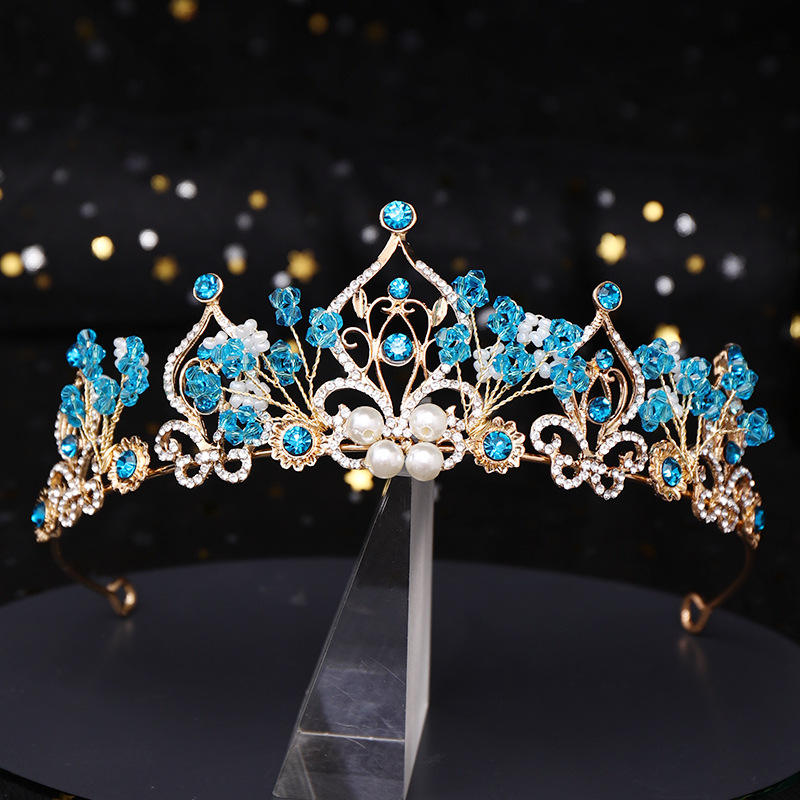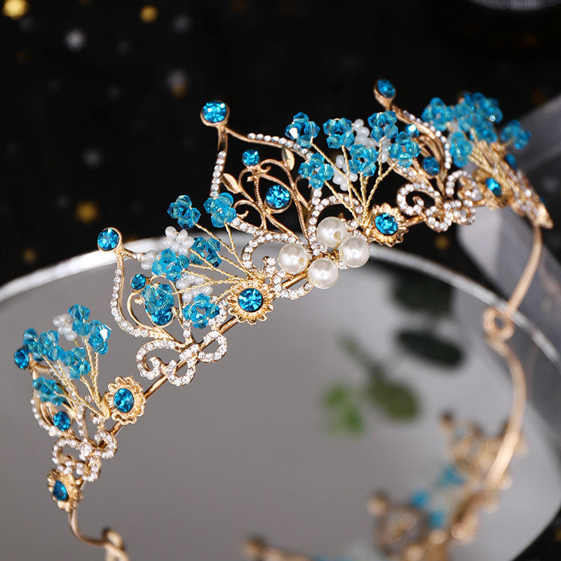 Nouvelle Couronne de Princesse Fleur Perle Cristal Bleu Diadème de Mariée Tiare Bijou de Tête Accessoire Cheveux Mariage