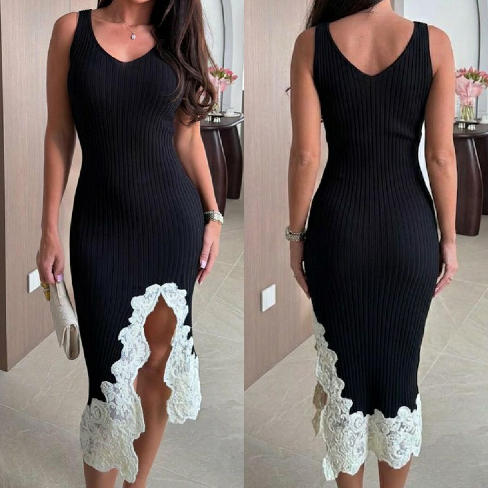 Robe midi côtelée Seraphina à ourlet en dentelle avec guipure festonnée, Robe midi en maille asymétrique à fente The Ivy