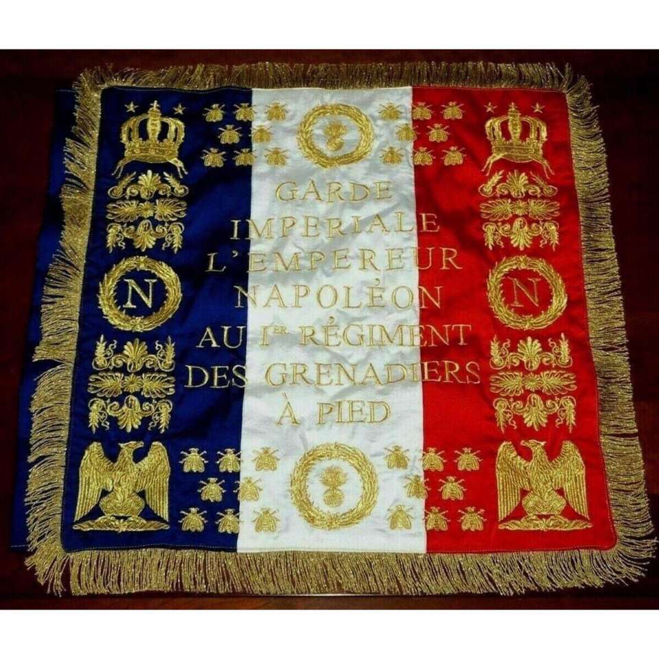 L'image montre les deux côtés d'un drapeau français historique, notamment celui du 1er bataillon du Pied de l'Empereur.