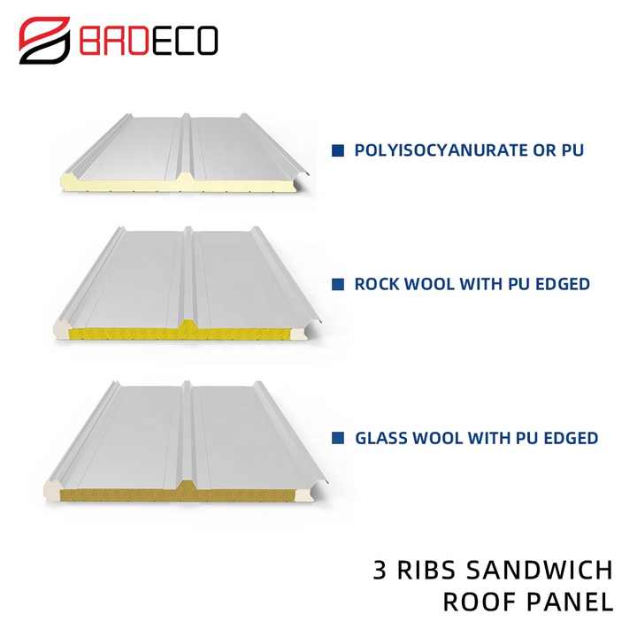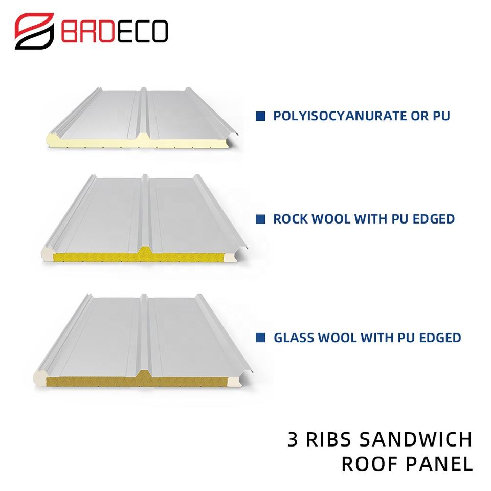 Thermal Insulation Fireproof Rockwool/Pu/Glass Wool 3 Rib Roof Sandwich Panels 200 mm 150 mm 120 mm 100 mm 75 mm 50 mm
