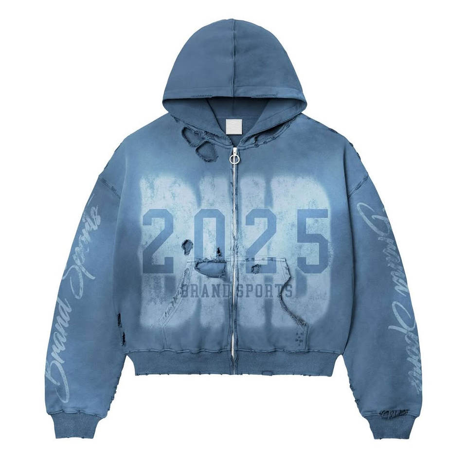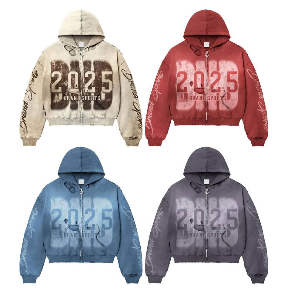 Sweat à capuche thermique zippé personnalisable pour impression sérigraphique, pour homme, coupe oversize, effet vieilli, délavé à l'acide, déchiré et à bords bruts