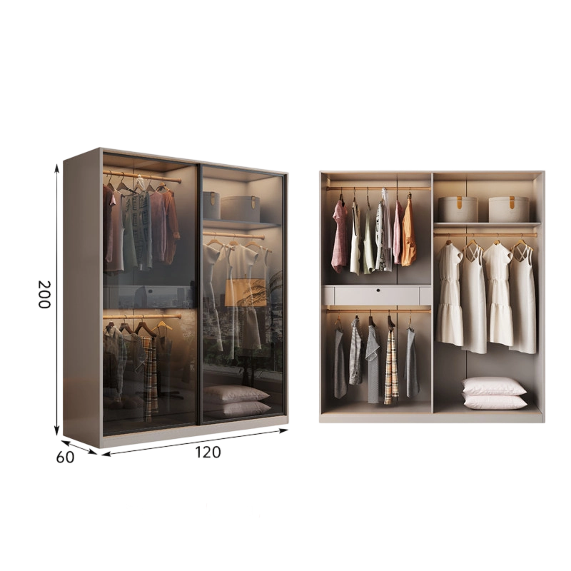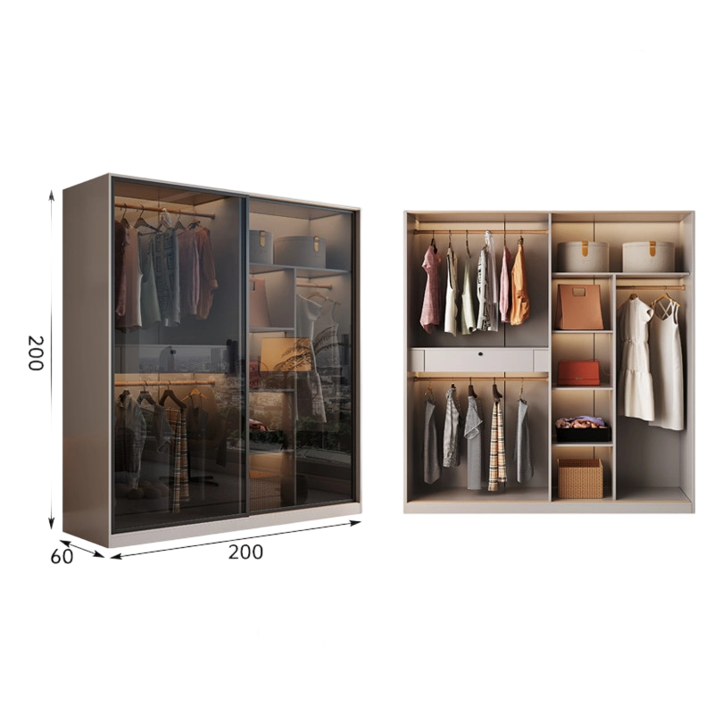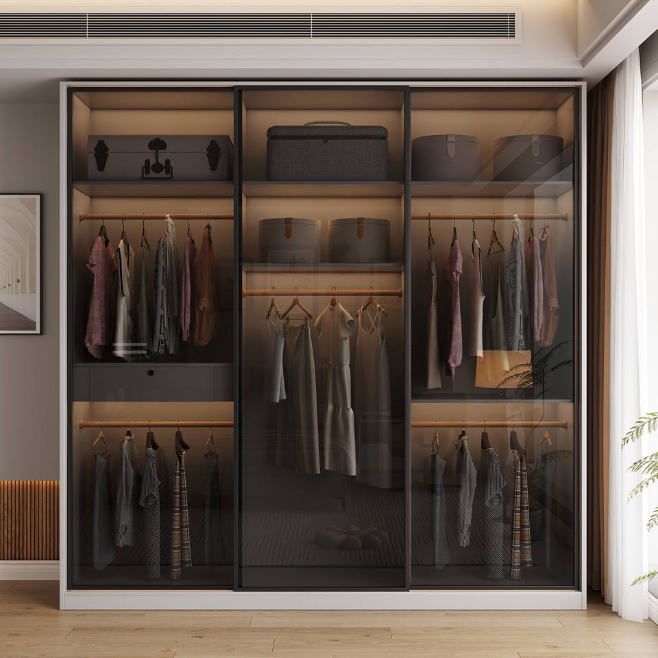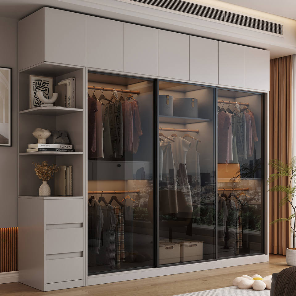 Armoire en panneaux OSB épaissis avec porte coulissante en verre, style moderne minimaliste, rangement spacieux pour la chambre à coucher, usage domestique