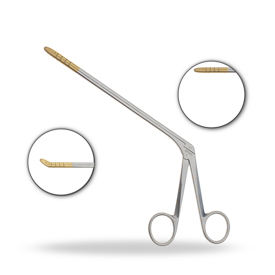 Instrument neurochirurgical de qualité supérieure fabriqué en acier inoxydable résistant à la corrosion avec des pointes plaquées or. Conception de tige fine de précision, disponible en modèles droits et angulaires, avec des tailles de 2 mm, 3 mm et 4 mm. Conçu pour l'extraction des disques intervertébraux lors des interventions sur la colonne vertébrale, assurant durabilité, précision et performance chirurgicale fiable.