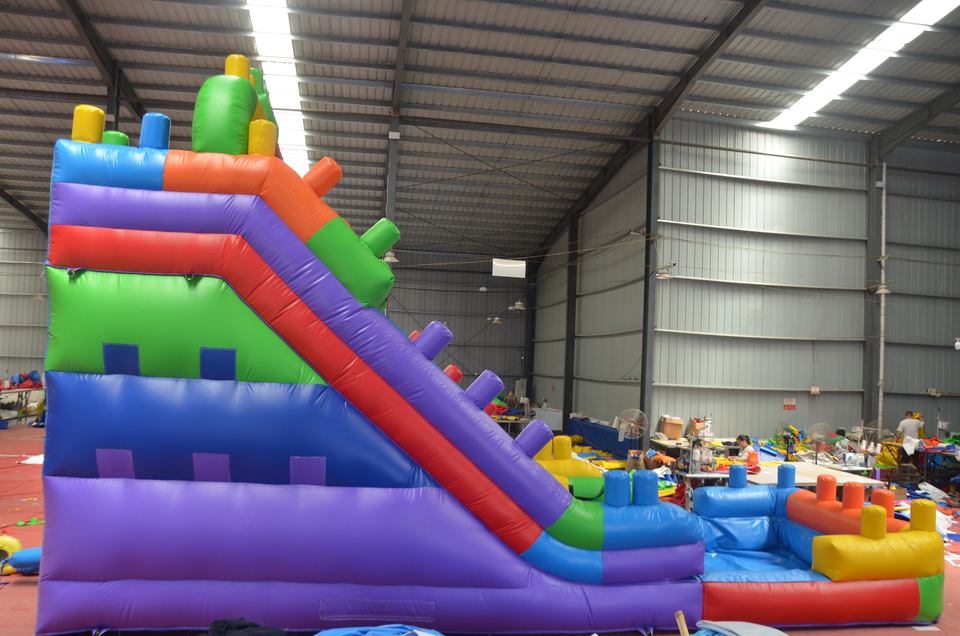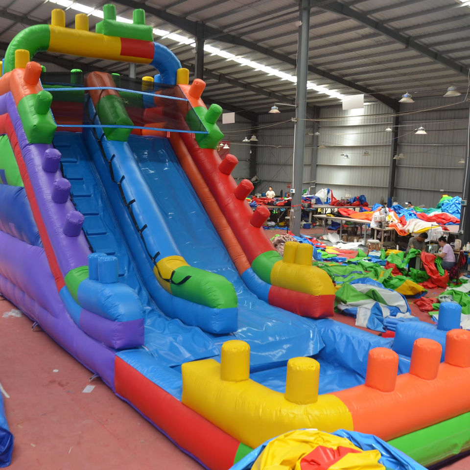 Ce grand toboggan aquatique gonflable sur le thème des blocs est un toboggan aquatique gonflable de style château avec une piscine.