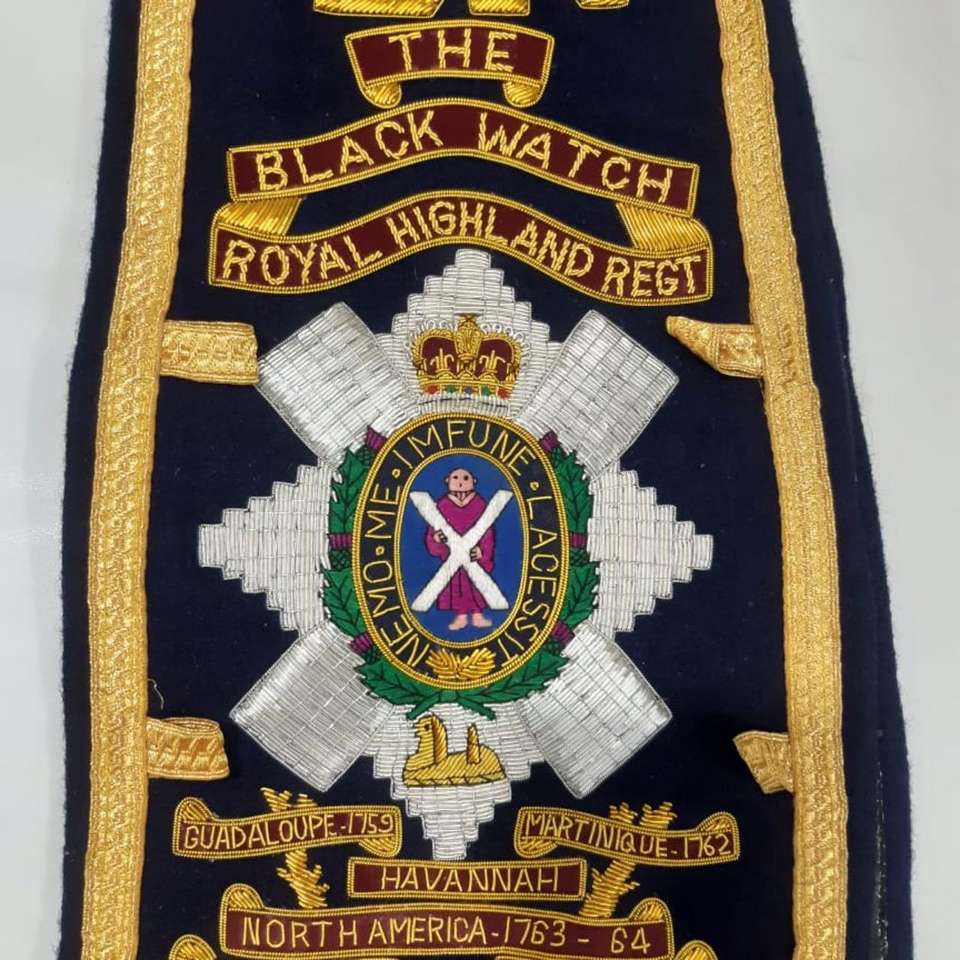 This is a Royal Highland Black Watch Drum Major's hand embroidered baldric sash in Blue fabric with gold braid Sash