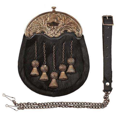 This is a Scottish full-dress kilt sporran with a Celtic cantle and a dragon emblem