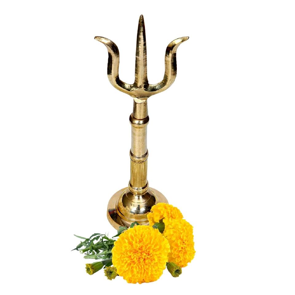 This is a beautifully crafted golden brass Trishul a sacred symbol in Hinduism representing Lord Shiva.