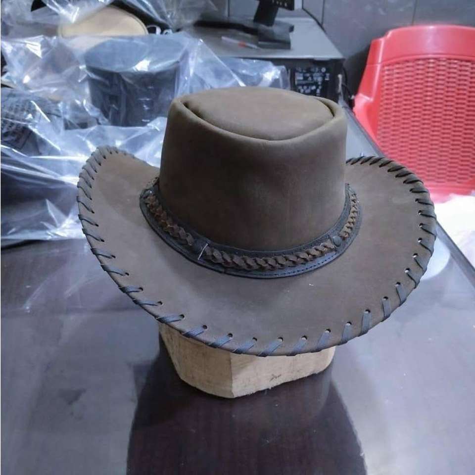 This is a black leather top hat with a silver concho band, similar to the signature style worn by Slash of Guns N' Roses