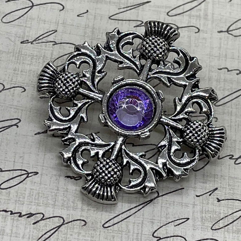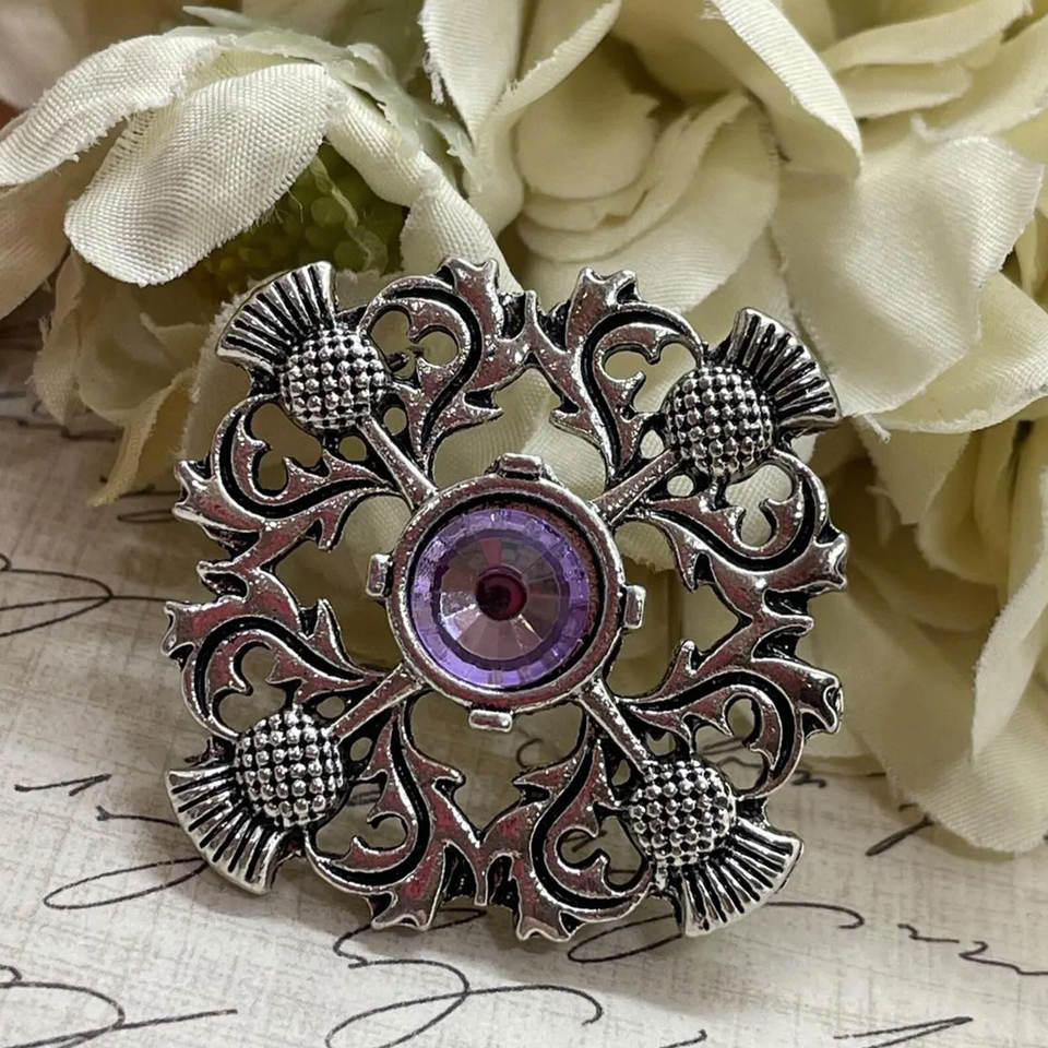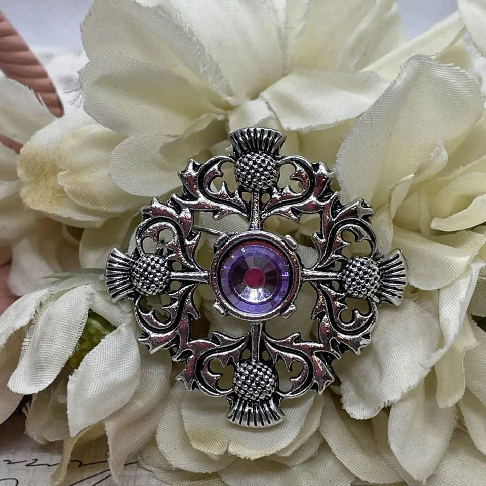 Broche classique écossaise en argent motif fleur de girofle, épinglette pour chapeau, bijou pour écharpe, pour festival, kilt et tenue irlandaise, violet