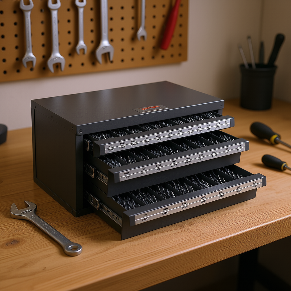 Armoire de rangement pour forets à trois tiroirs, de 1/16 à 1/2, en acier, avec étiquettes empilables pour le rangement des forets, armoires à outils
