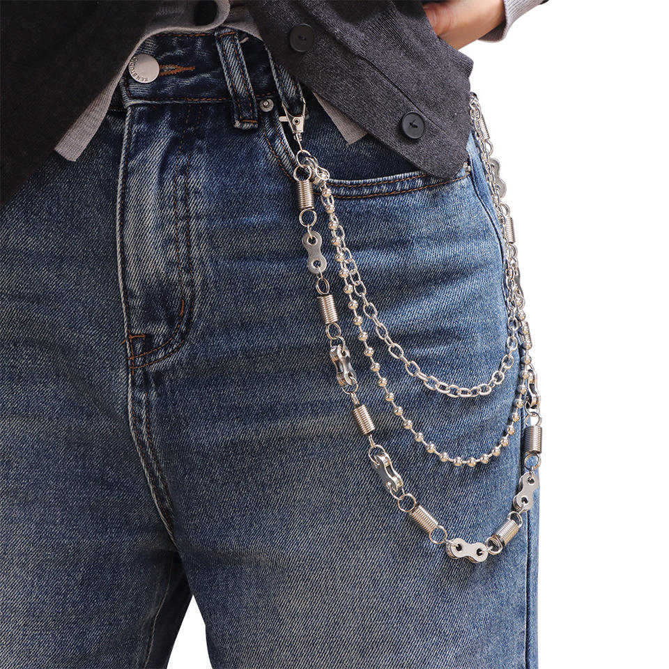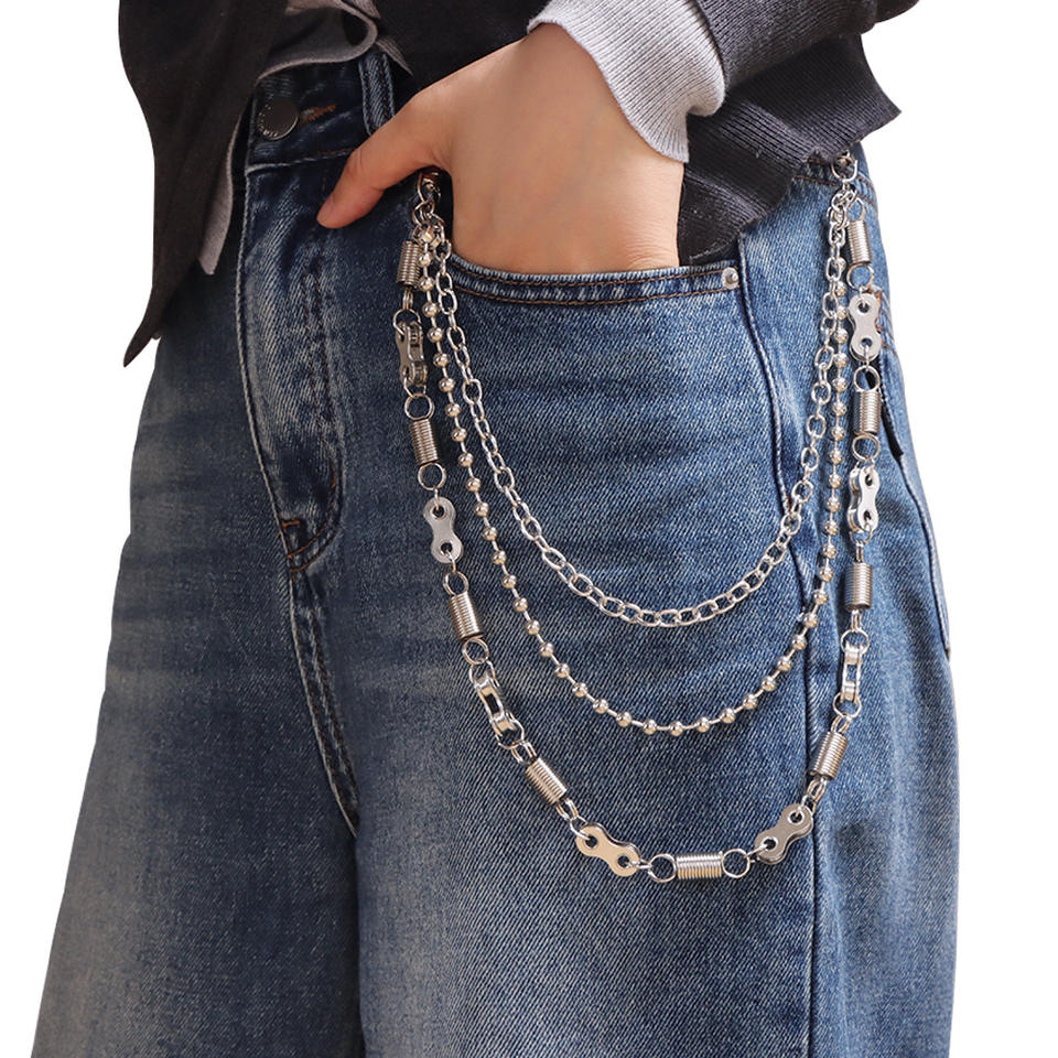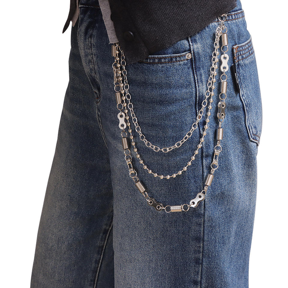 Chaîne de taille punk à trois couches pour jeans, avec perles rondes en argent tibétain et fermoir à ressort, chaîne de corps décontractée et tendance