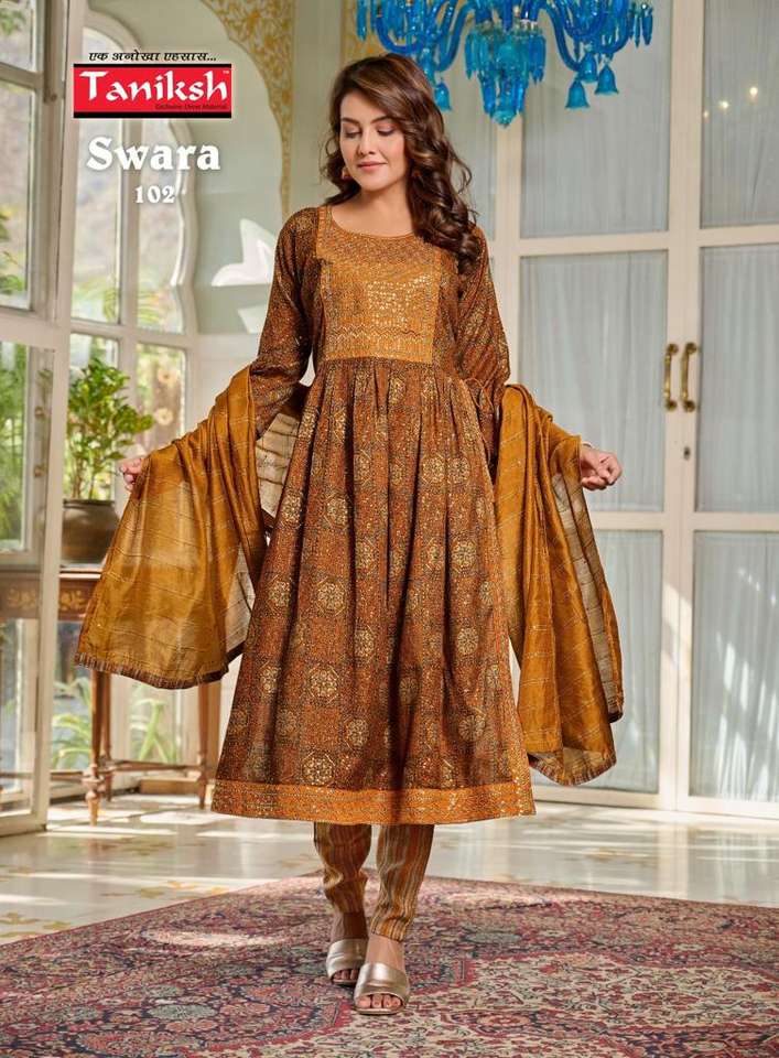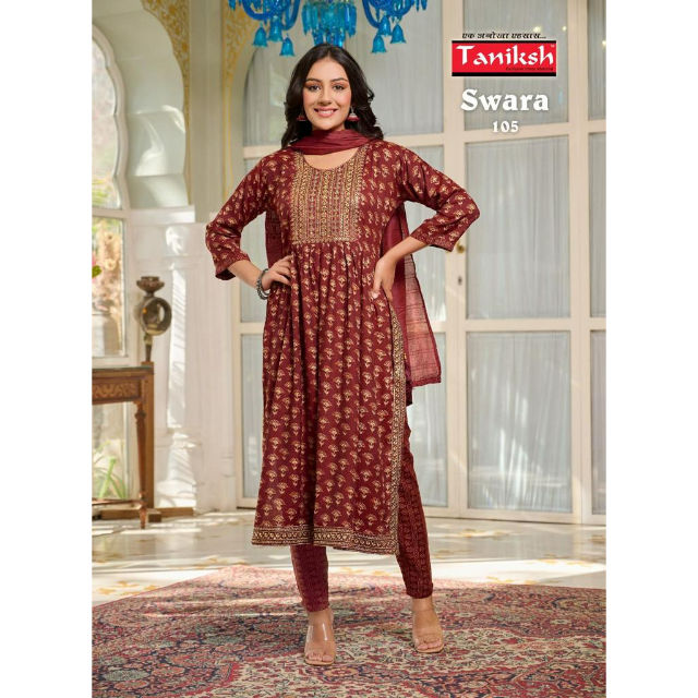 Ensemble trois pièces en rayonne lourde Nayra, comprenant un kurti, un pantalon et un dupatta.