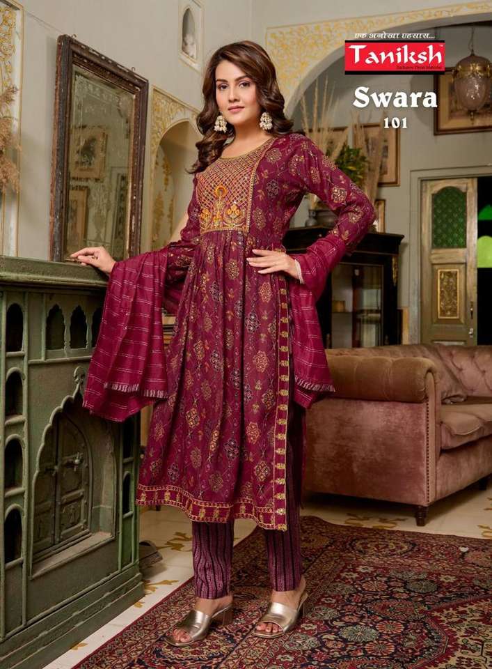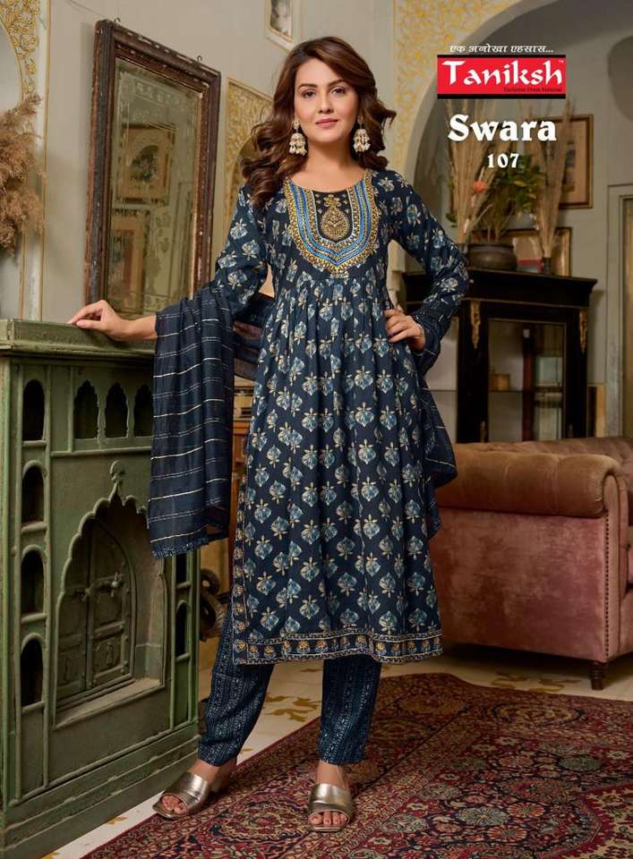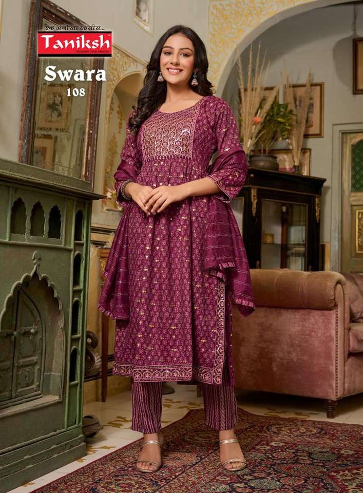 Collection de trois pièces en rayonne lourde, coupe Nayra, broderie séquentielle, pantalon Kurti de travail avec dupata, fabricant de mode pour femmes