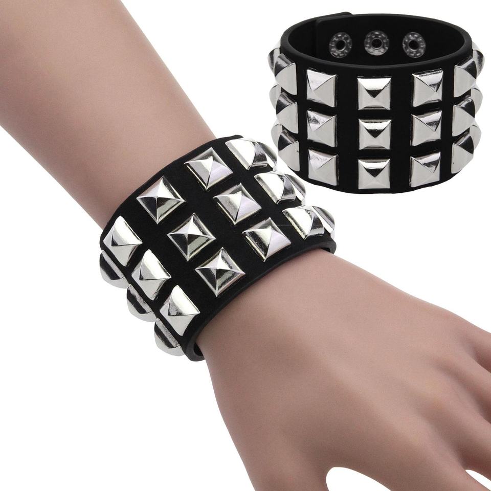 Bracelet à ongles carrés à trois rangées Bracelet large en cuir Punk accessoires de motocycliste rétro personnalisés