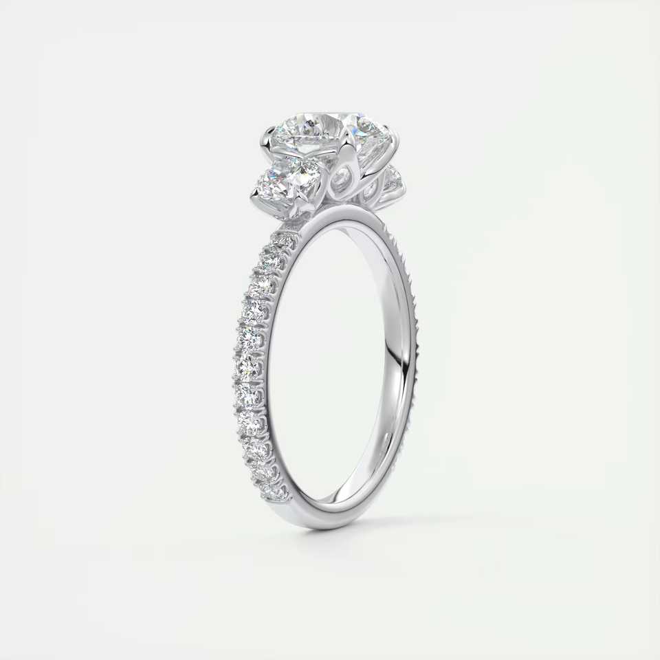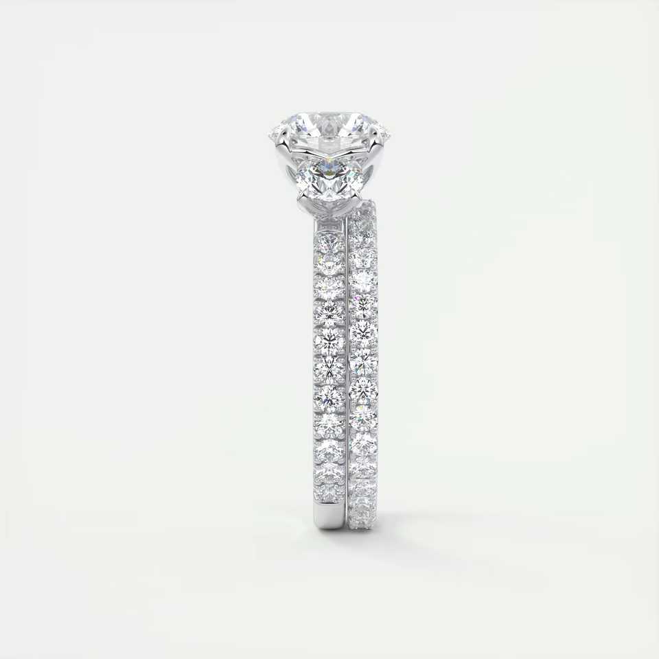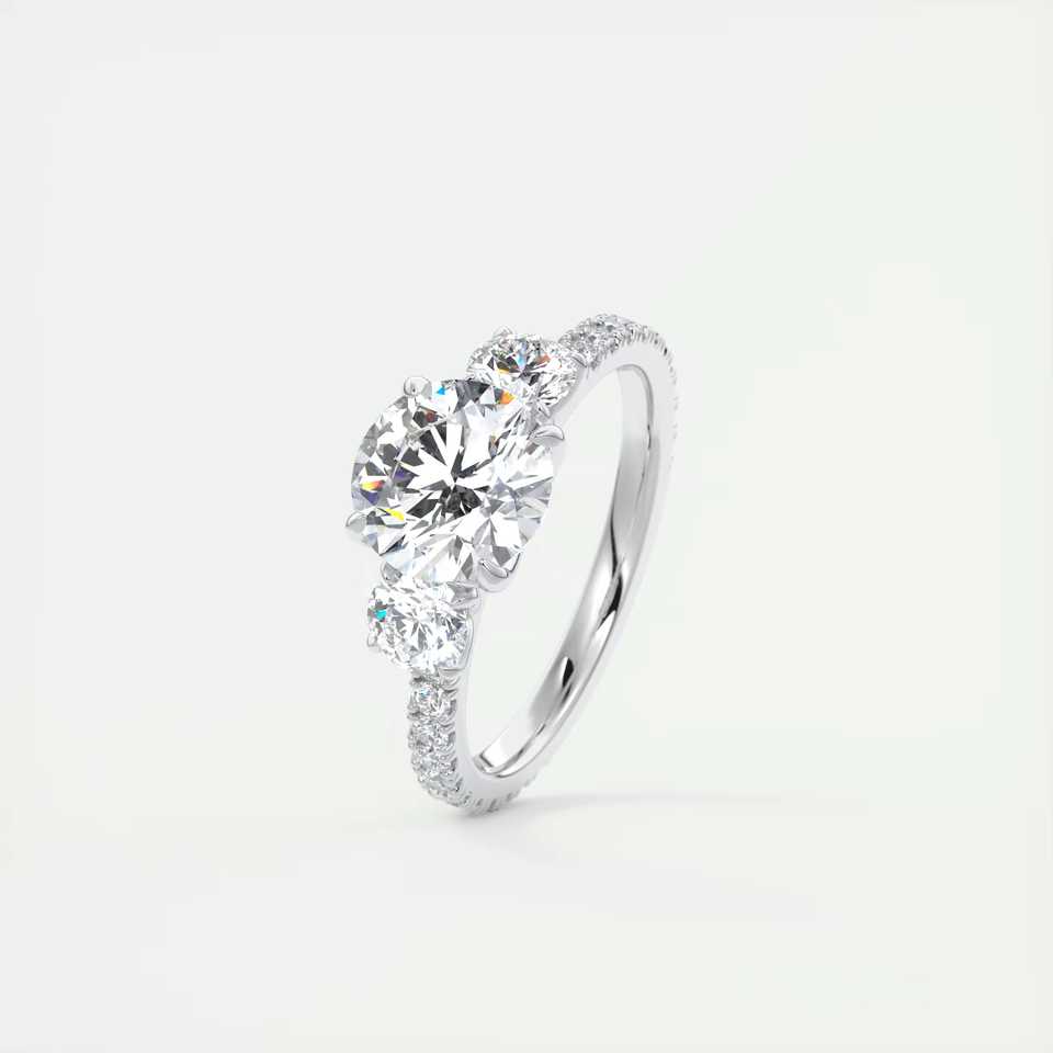 Bague de fiançailles à trois pierres avec diamants ronds de laboratoire de 2,50 carats et pavé français 3/4 en or blanc 14 carats