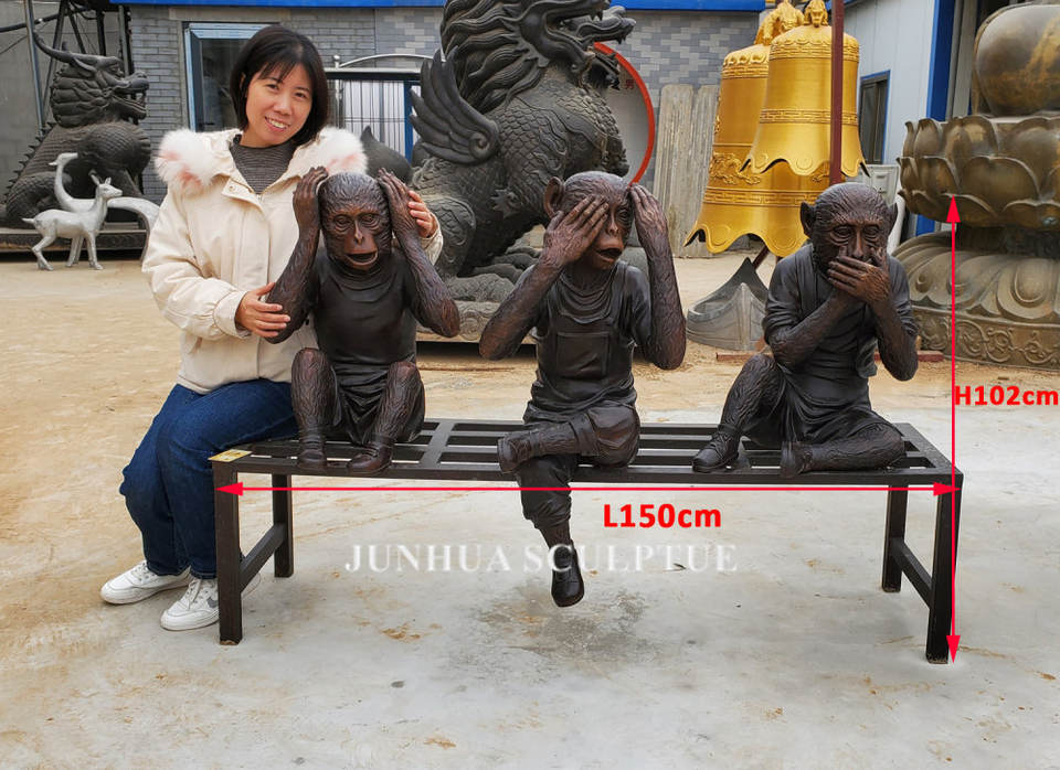 Statue de trois singes en bronze sage sur banc ne parle pas de mot n'écoute pas sculpture singes en bronze sur banc sculpture
